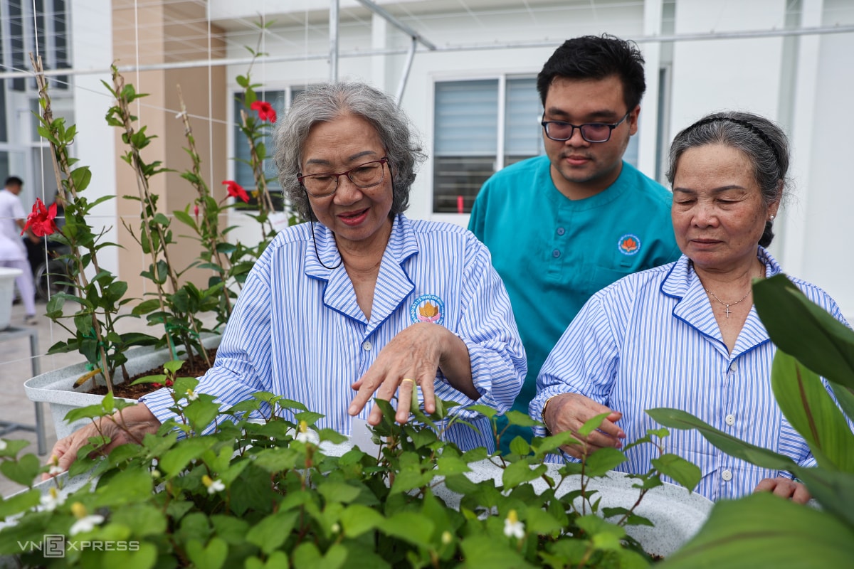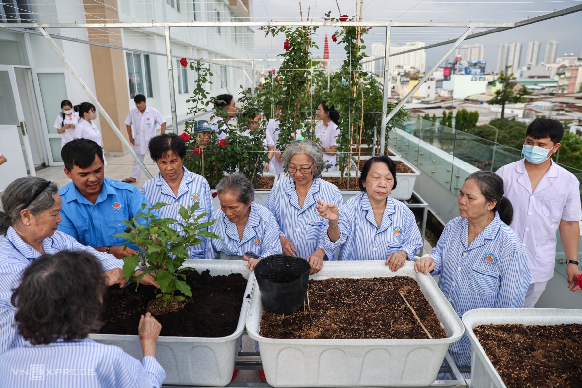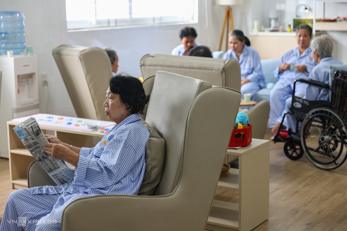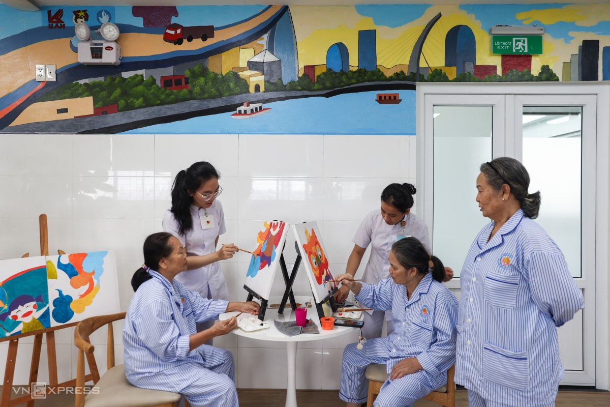 Bà Len, cùng 20 người khác đều trên 70 tuổi, mỗi ngày được con cháu đưa đến Bệnh viện Phục hồi chức năng theo dịch vụ dưỡng lão "sáng đi chiều về", bắt đầu từ 8h.