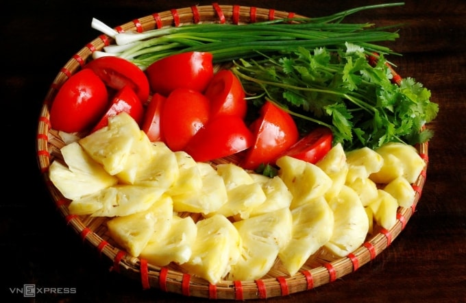Sơ chế rau củ và rau thơm: Dứa gọt vỏ, cắt miếng vừa ăn. Cà chua bổ múi cau. Hành lá và rau mùi rửa sạch, cắt khúc. Dứa mang vị chua dịu, giúp cân bằng vị ngọt tự nhiên từ mực, tạo điểm nhấn thanh mát cho nước canh, đồng thời giúp món ăn dễ tiêu. Cà chua không chỉ tạo màu đỏ đẹp mắt mà còn cung cấp vị umami, làm nước canh đậm đà và tăng cảm giác tròn vị. Hành lá và rau mùi được thêm gần cuối nấu sẽ giữ màu xanh tươi và hương thơm, kích thích khứu giác, đồng thời bổ sung lớp hương nhẹ nhàng đặc trưng cho món canh nấu ngót.