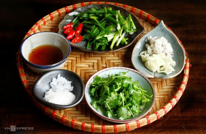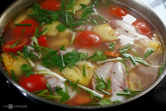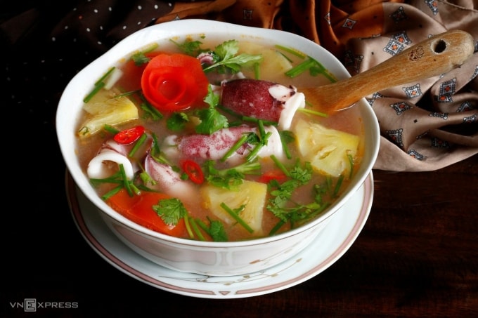 Chuẩn bị các gia vị: Hành tím và tỏi nên băm nhỏ hoặc giã nát để giải phóng tinh dầu tự nhiên, giúp nước canh dậy mùi thơm. Ớt bỏ hạt, cắt lát vừa ăn, chỉ thêm vào khi nấu gần cuối hoặc dùng để trang trí, giữ được màu đỏ tươi và vị cay dịu, không át đi vị tự nhiên của mực và dứa. Gia vị nêm nếm nên giữ vị mộc, thanh tự nhiên: muối hạt, mắm truyền thống và một chút đường để cân bằng vị chua dịu từ dứa.