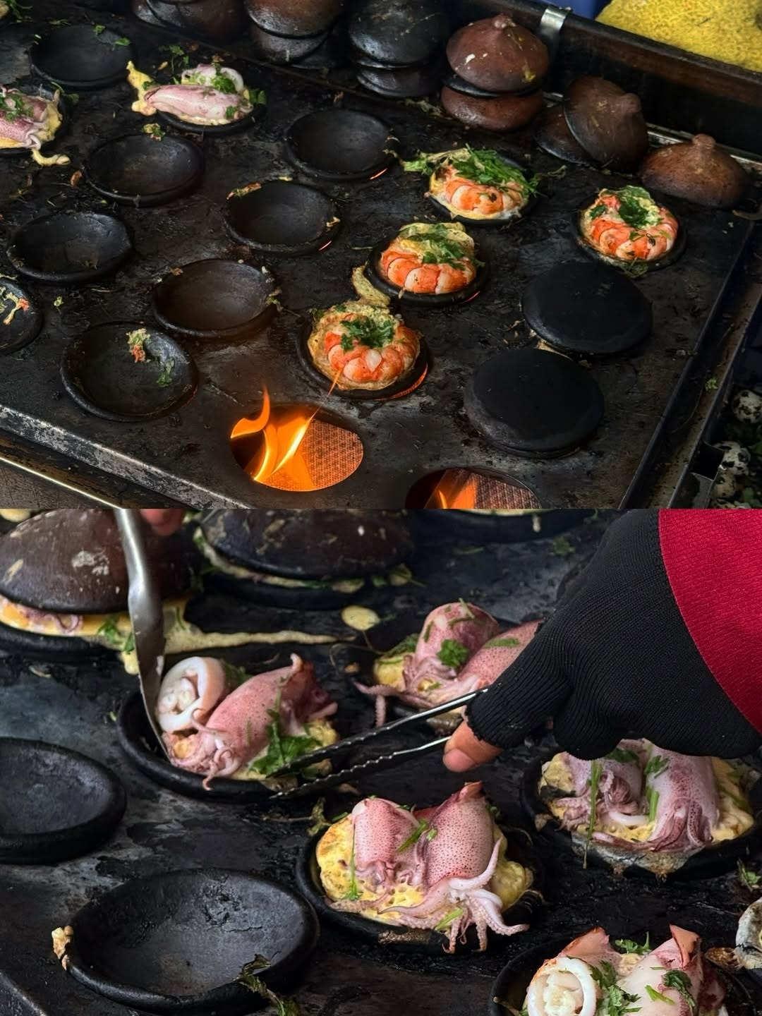 Gia đình sao thưởng thức món bánh khọt ở một quán vỉa hè.