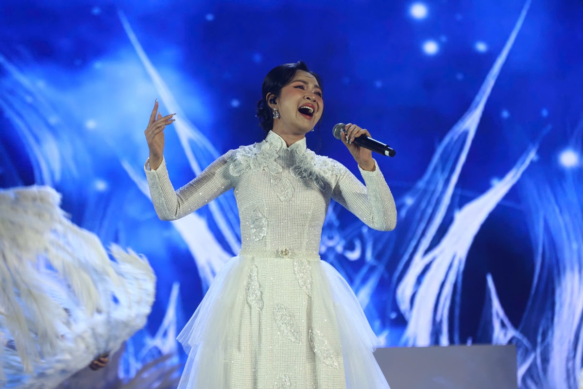 Duyên Quỳnh thể hiện nhạc phẩm Viết tiếp câu chuyện hòa bình với phần múa minh họa của vũ đoàn Phương Việt. Với giọng hát cao, khỏe, cô thể hiện trọn vẹn tinh thần của bài hát. Ở phía dưới, khán giả bật đèn flash cổ vũ cho ca sĩ.