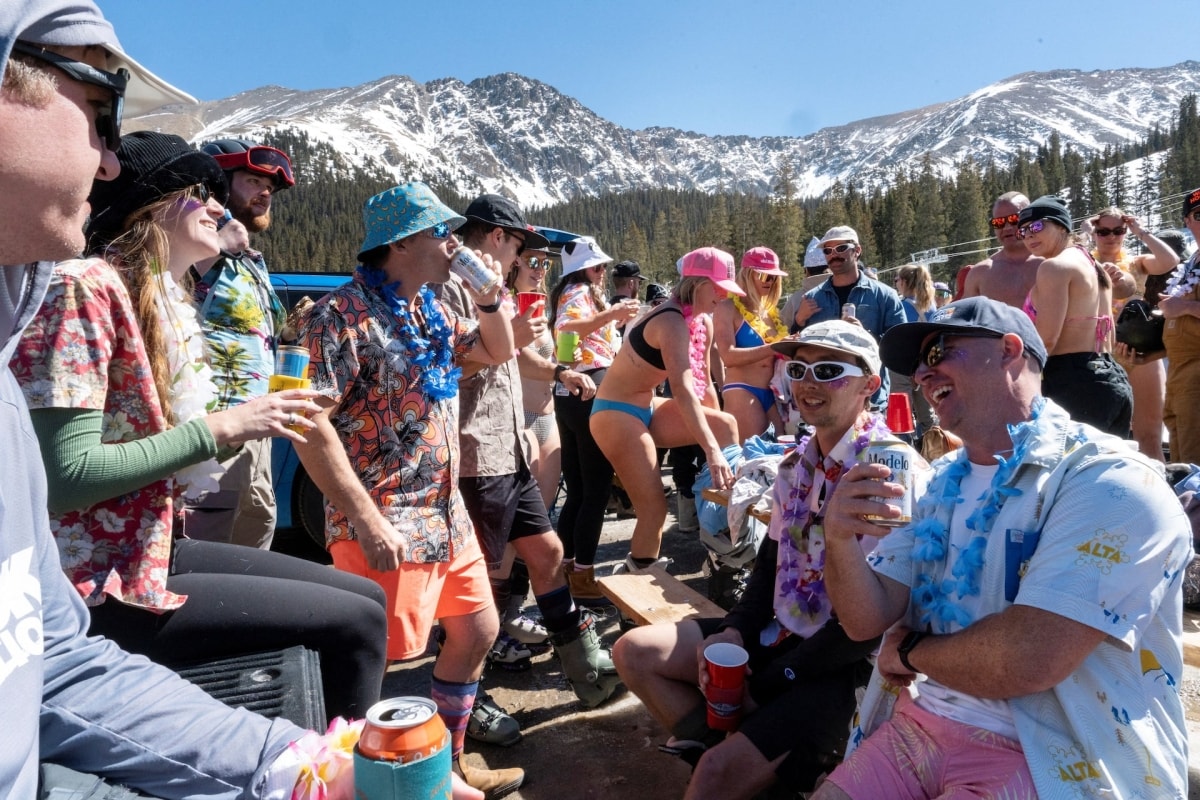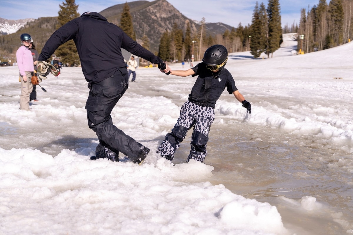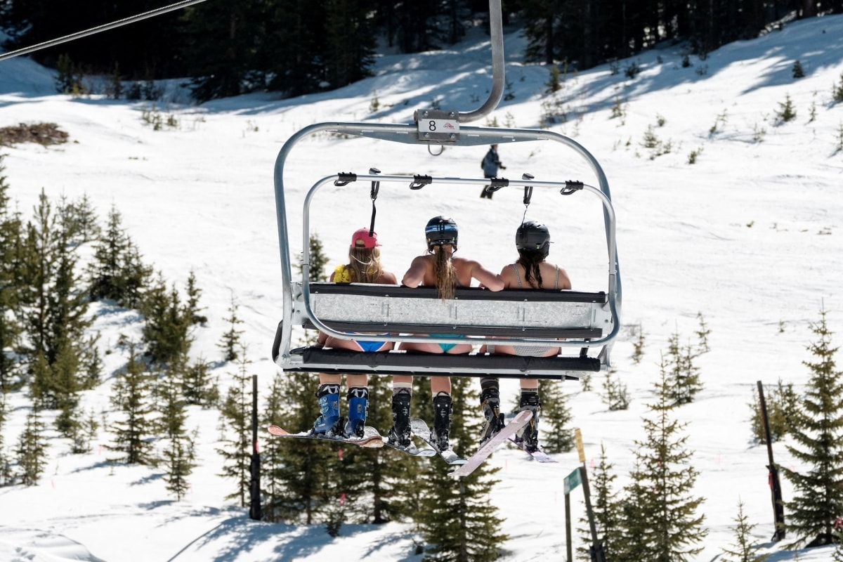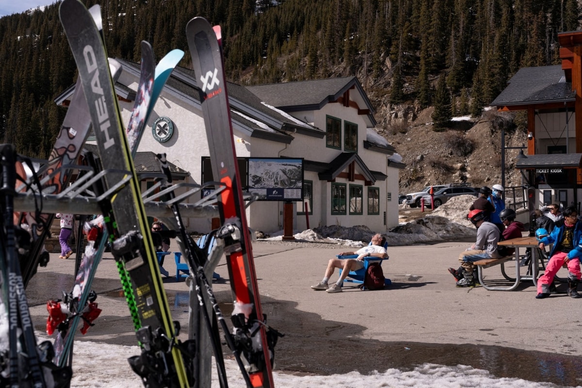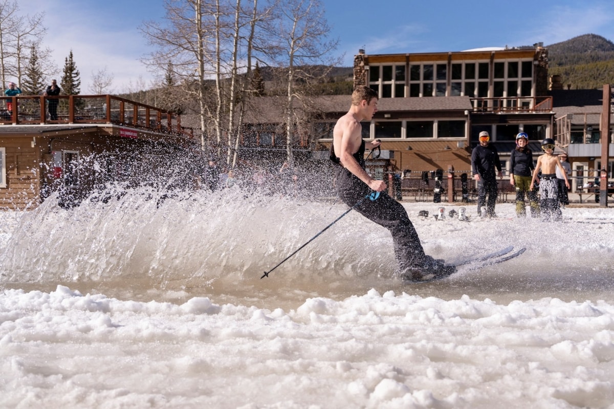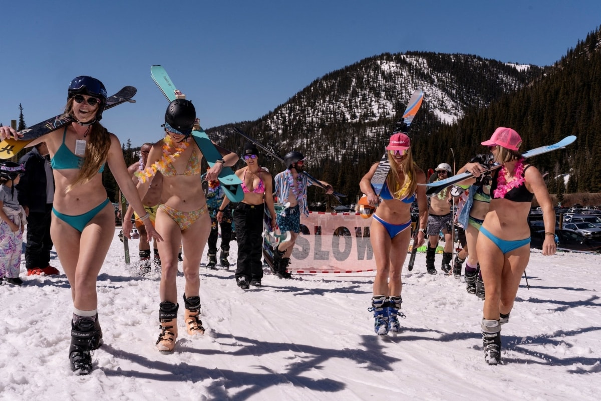 Cảnh tượng khác thường xuất hiện ở Keystone, Colorados khi nắng nóng làm tan chảy tuyết, người đi chơi bỏ áo khoác dày để mặc đồ bơi trượt tuyết.