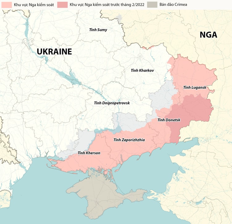 Nga đang nắm giữ hơn 99% lãnh thổ tỉnh Lugansk, 60% diện tích Donetsk, 70% tỉnh Zaporizhzhia và Kherson, cùng một số khu vực tại tỉnh Dnipropetrovsk, Sumy và Kharkov. Nếu tính cả bán đảo Crimea, Nga đang kiểm soát khu vực tương đương 19% diện tích Ukraine trước năm 2014.