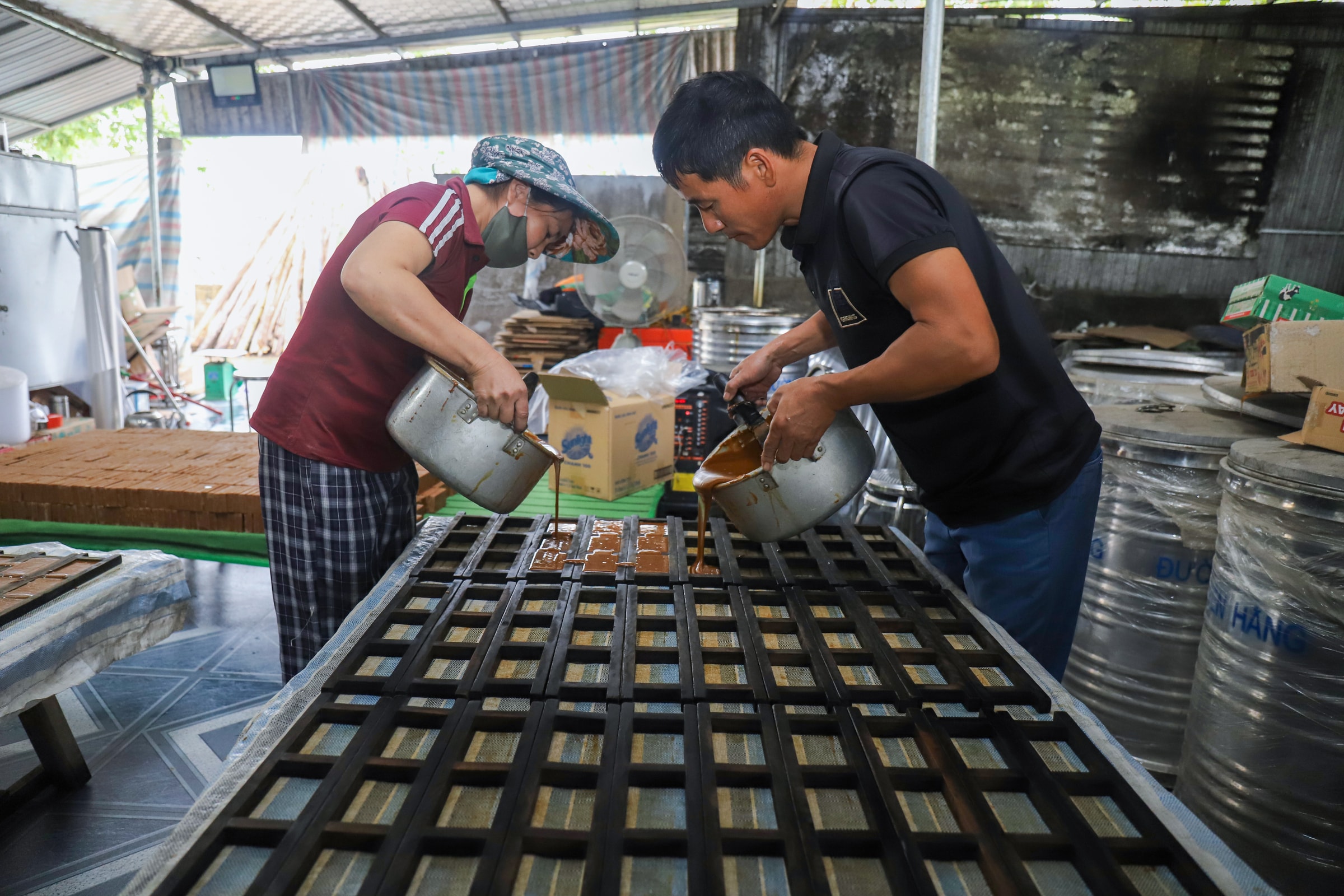 Sau khi đổ khuôn khoảng 15 phút, đường bắt đầu cô đặc, người thợ sẽ tháo khuôn.