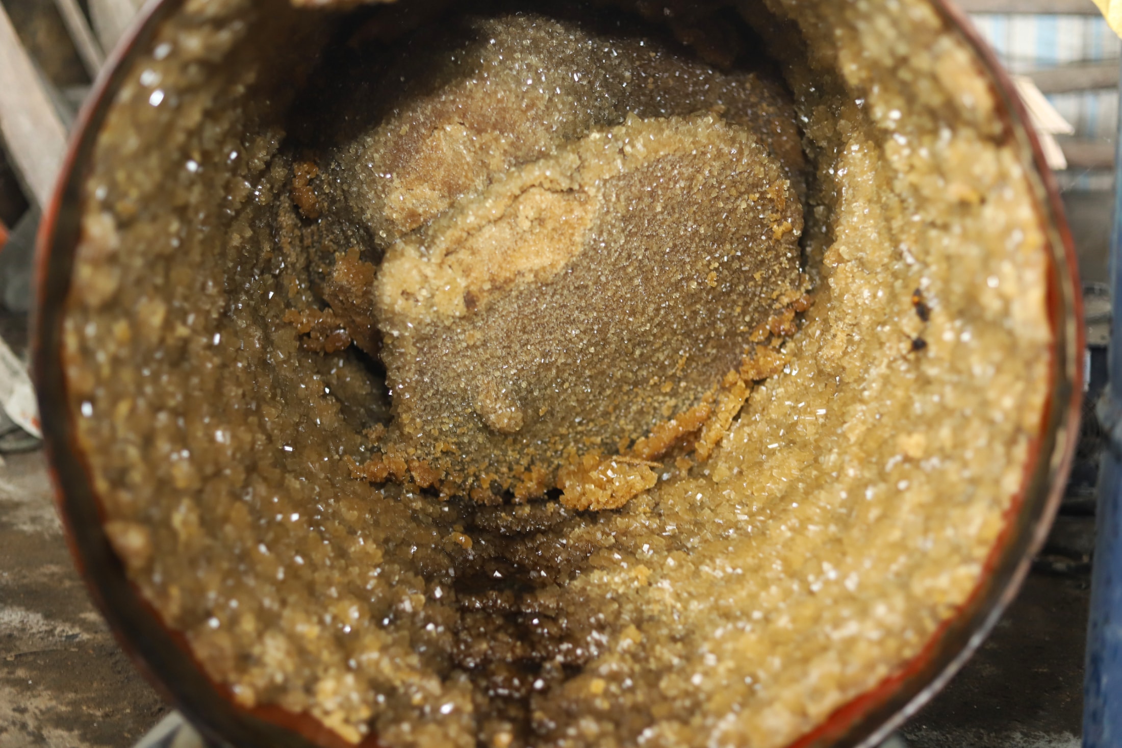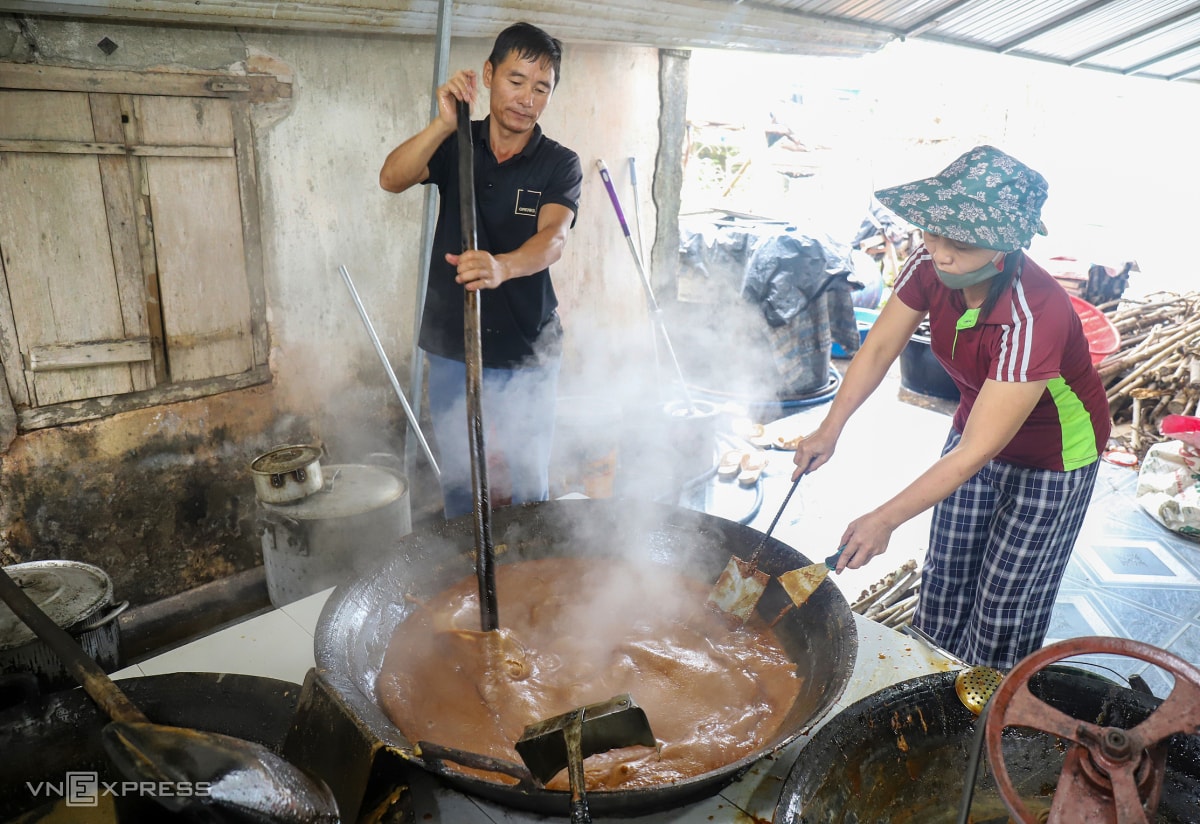 Một mẻ trung bình nấu hơn 20 lít mật, cho thành phẩm 20 kg đường phên. Hằng ngày vợ chồng anh Yên nấu khoảng 300 kg mật, làm từ 6h, buổi trưa nghỉ ngơi khoảng hai tiếng rồi làm đến 17h.