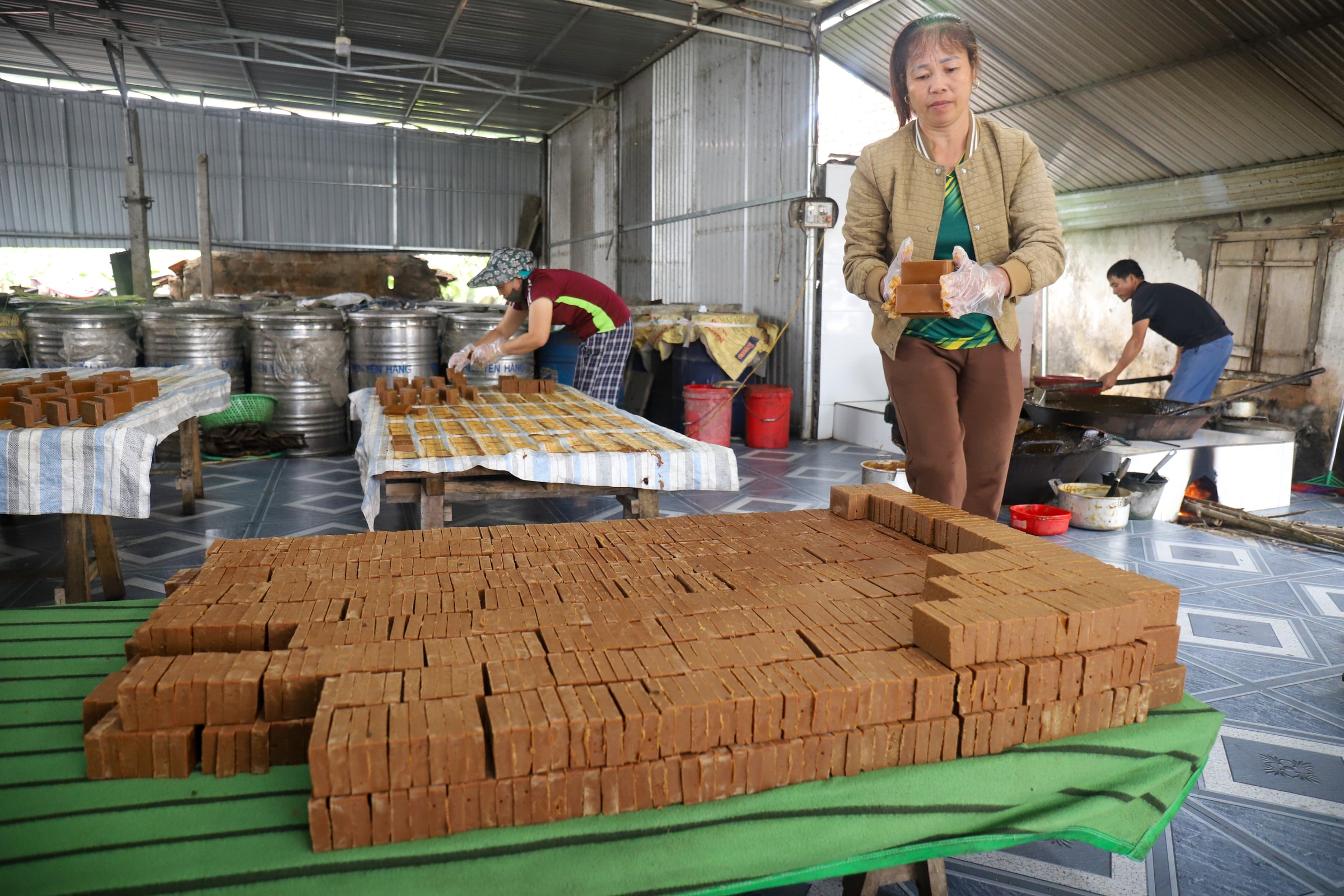 Người dân xã Nghĩa Hưng nấu mật mía đổ vào khuôn làm đường phên, bán 27.000-28.000 đồng một kg.