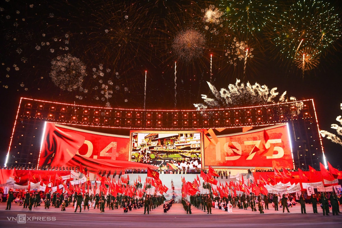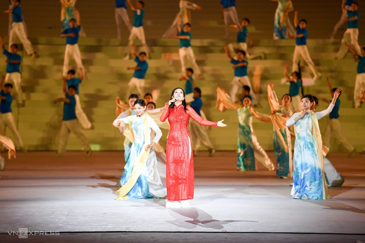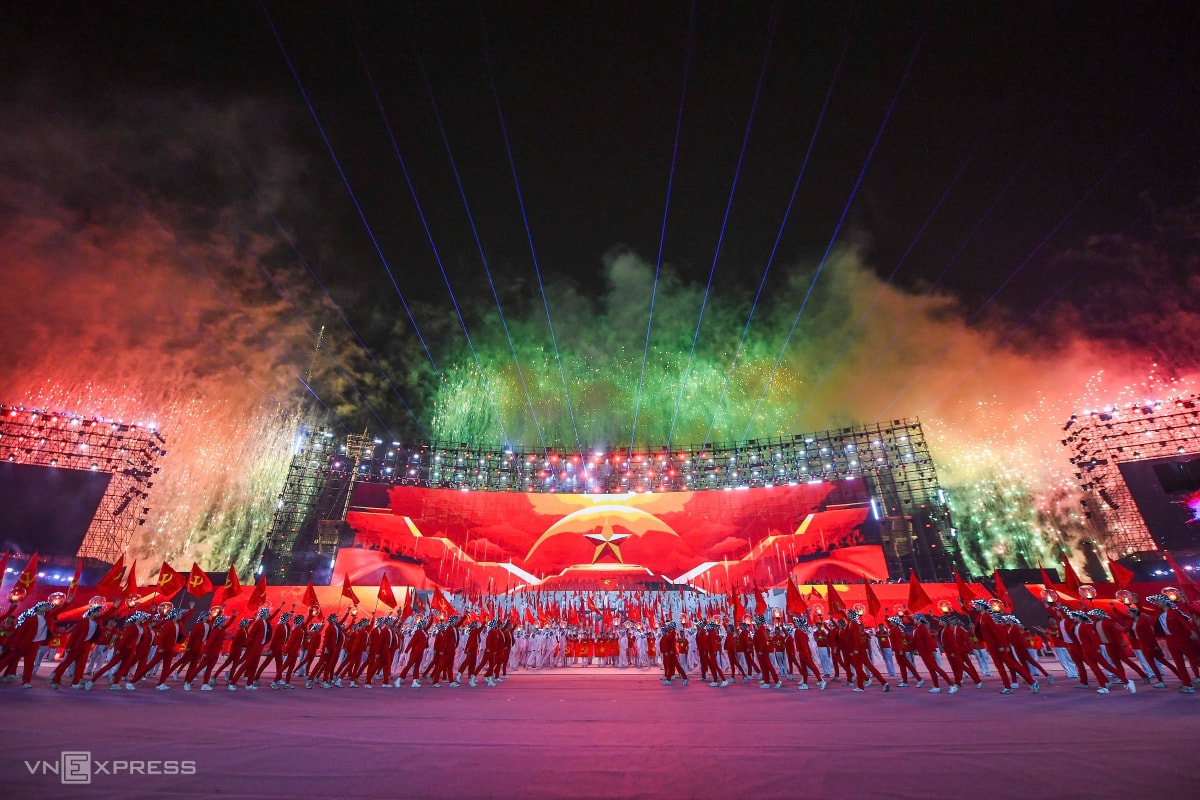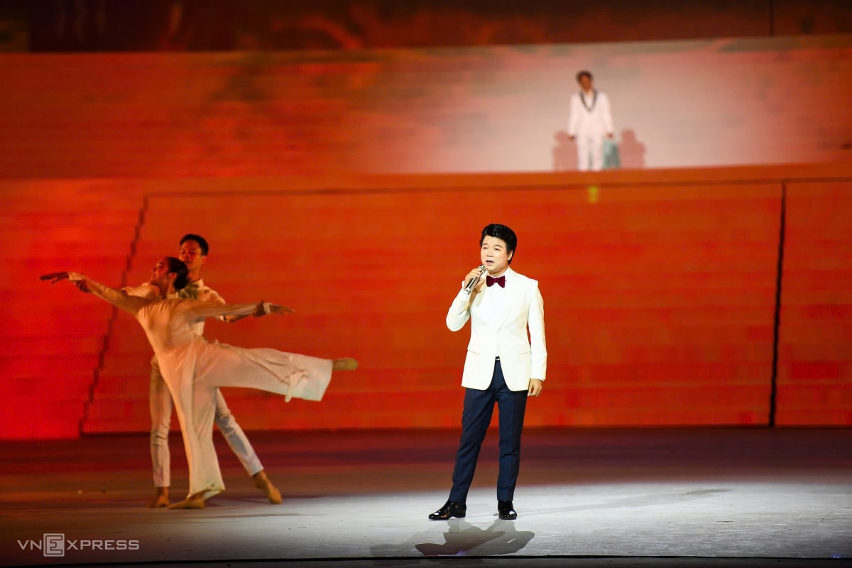 Ca sĩ Hồng Nhung, Vũ Thắng Lợi và hàng nghìn nghệ sĩ, diễn viên tham gia các màn biểu diễn kết hợp nghệ thuật, công nghệ, trong chương trình chào mừng Đại hội XIV.