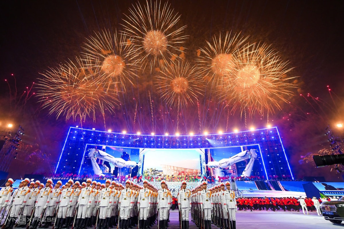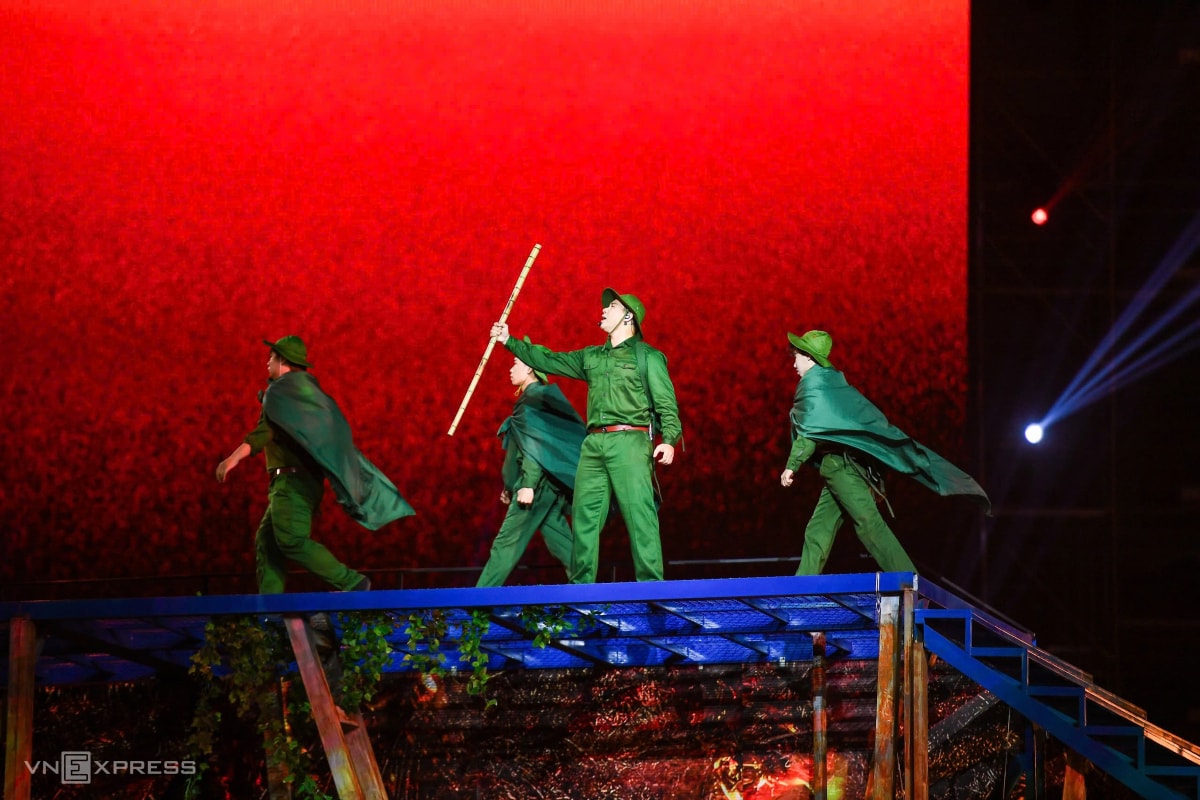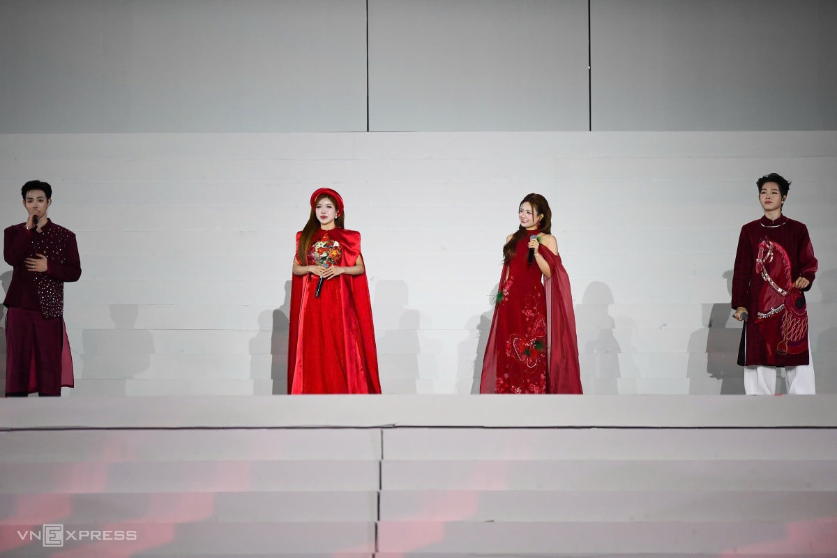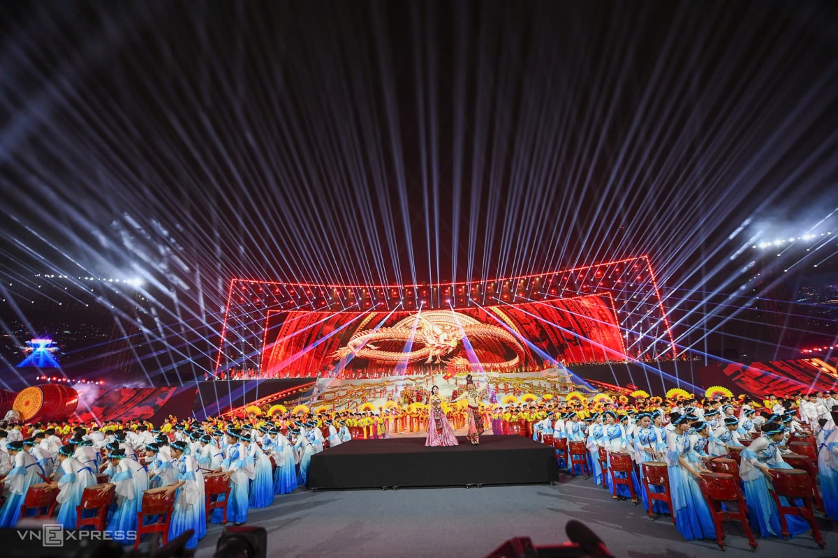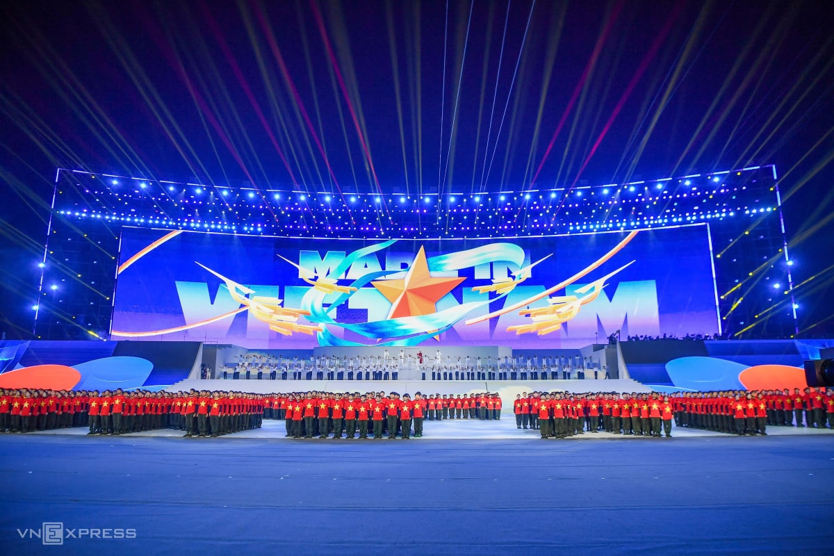 Ca sĩ Hồng Nhung, Vũ Thắng Lợi và hàng nghìn nghệ sĩ, diễn viên tham gia các màn biểu diễn kết hợp nghệ thuật, công nghệ, trong chương trình chào mừng Đại hội XIV.
