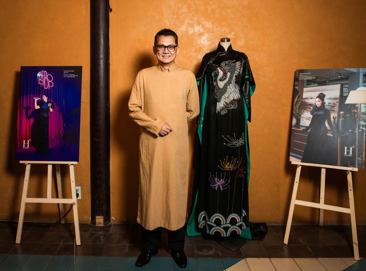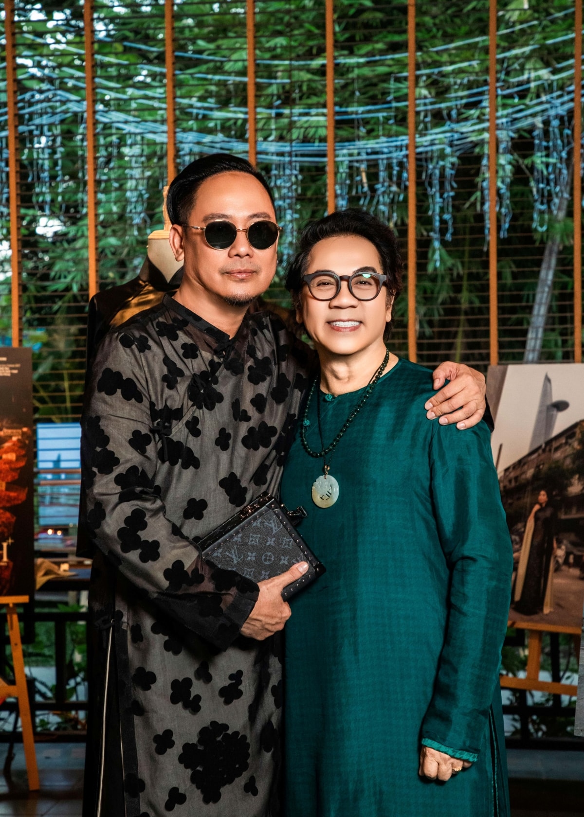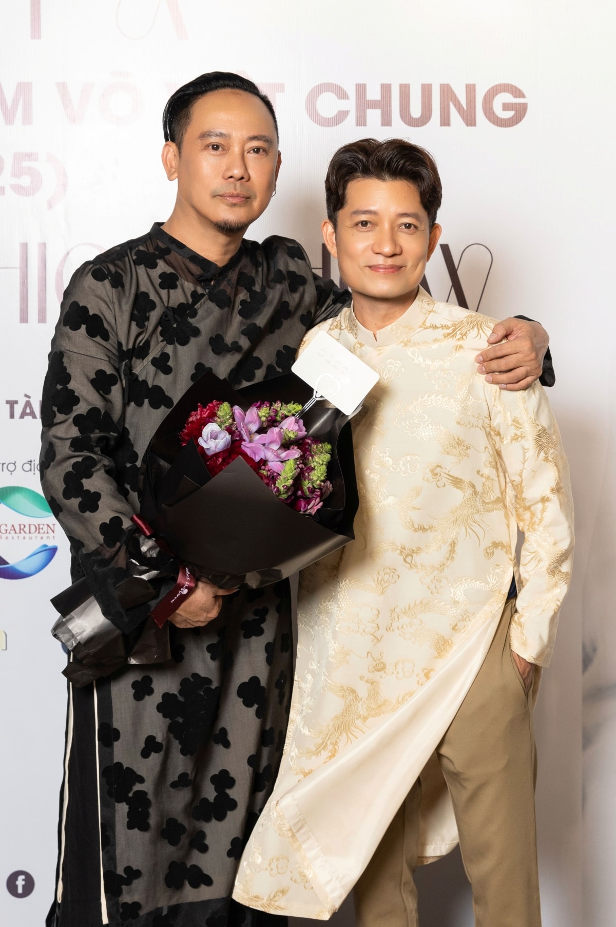 Nghệ sĩ Hữu Châu, Thành Lộc mặc áo dài dự triển lãm kết hợp show thời trang của nhà thiết kế Võ Việt Chung.