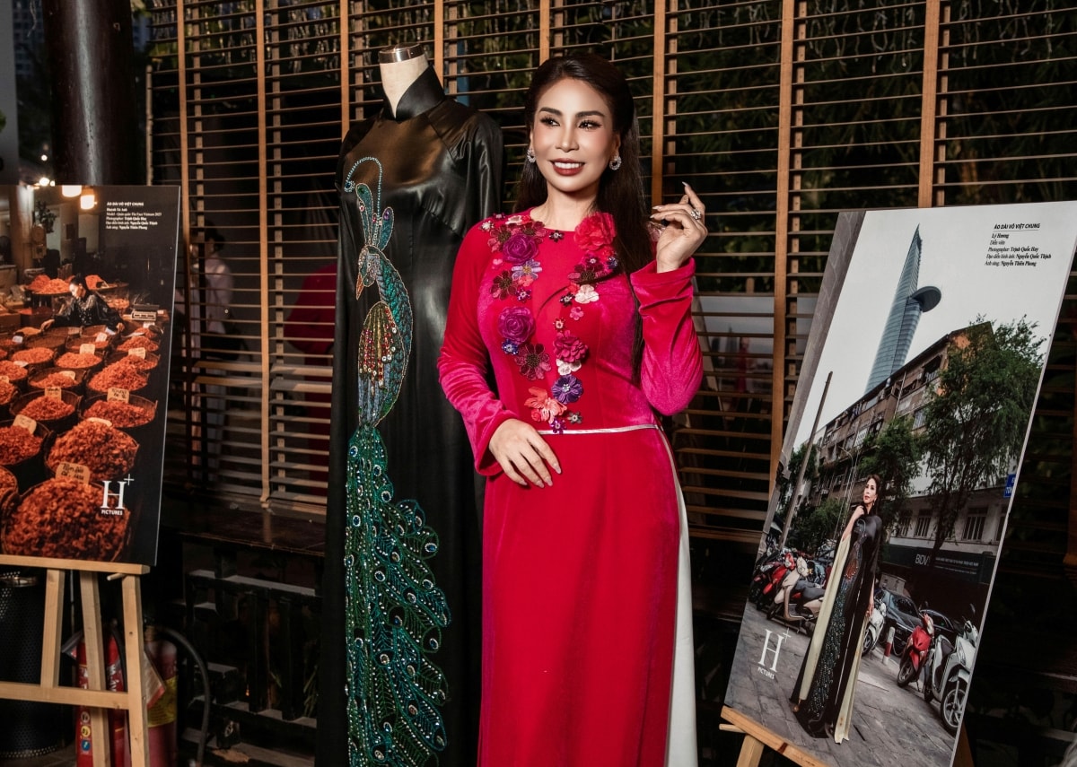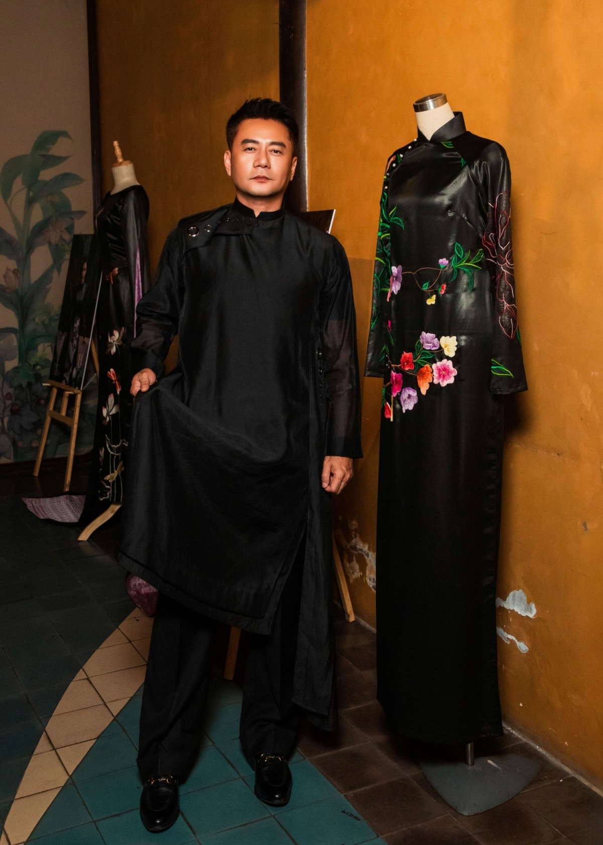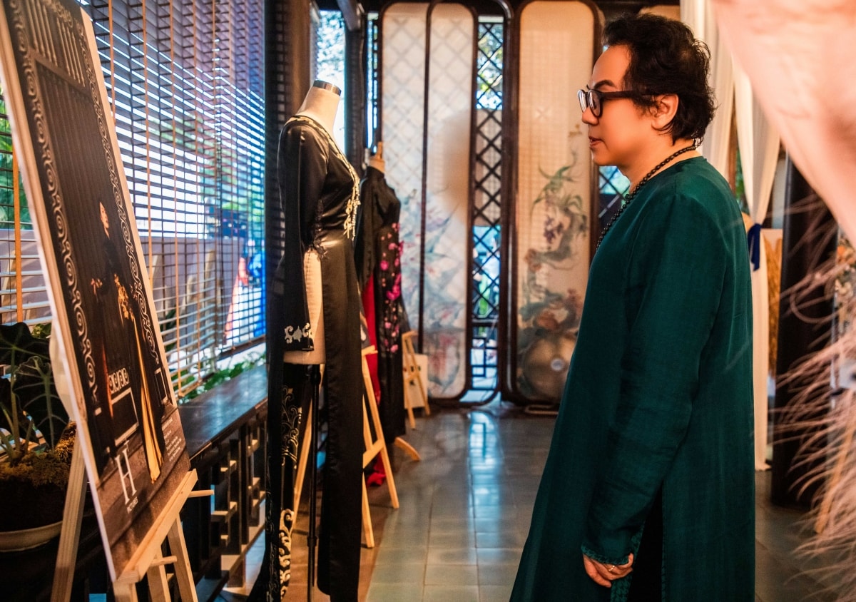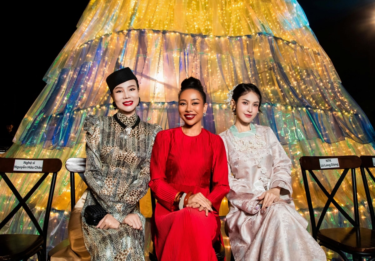 Nghệ sĩ Hữu Châu, Thành Lộc mặc áo dài dự triển lãm kết hợp show thời trang của nhà thiết kế Võ Việt Chung.