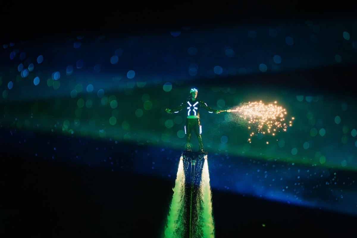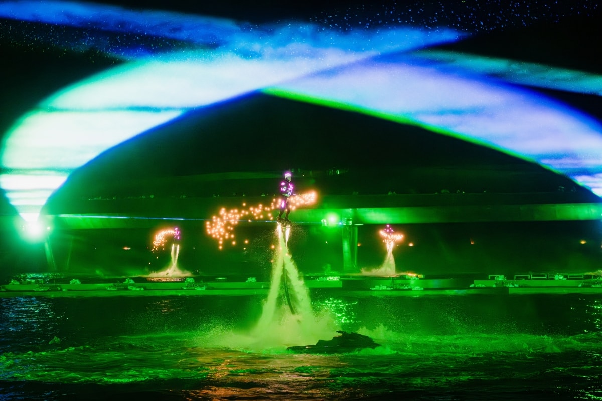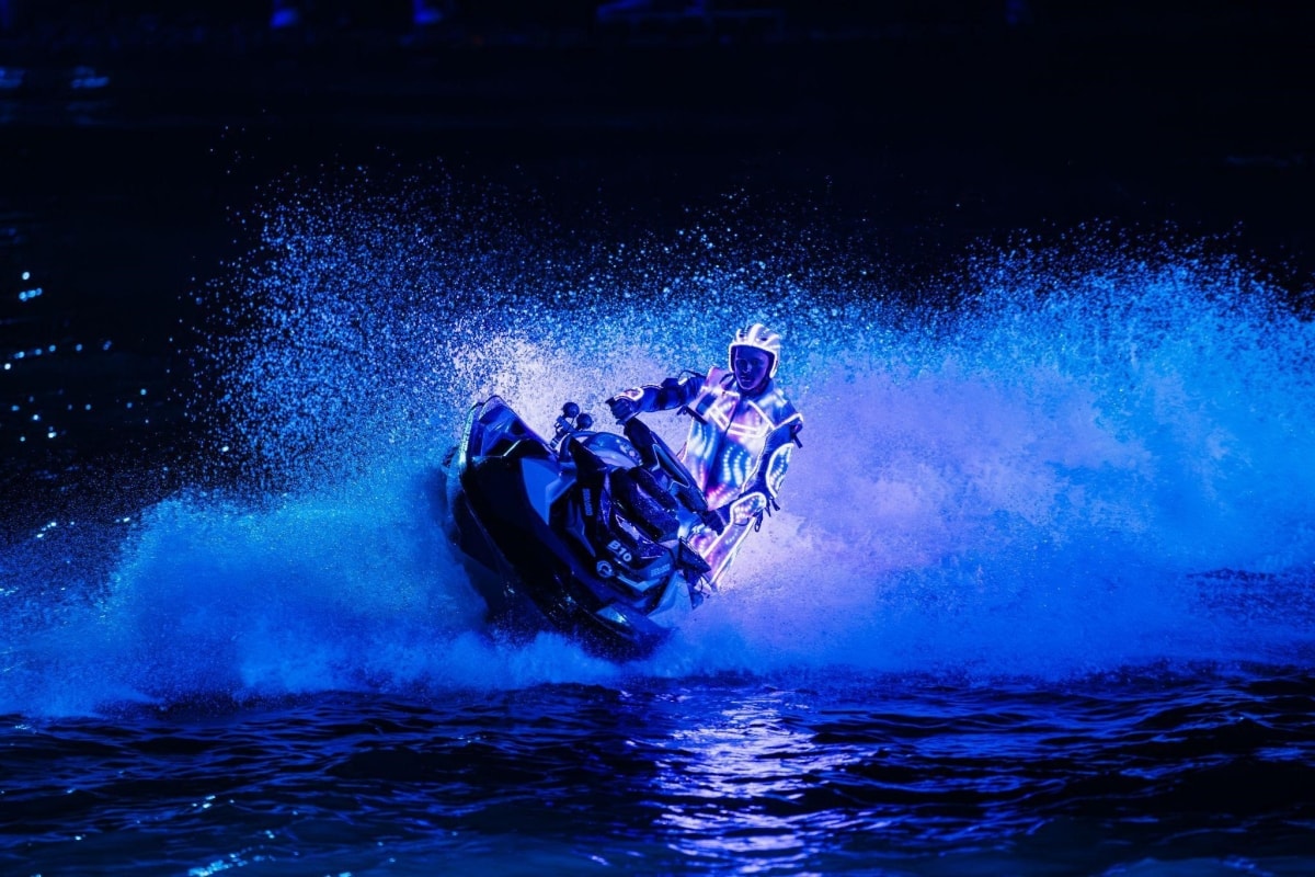 Show diễn "Bản giao hưởng đại dương" mùa 2 bắt đầu tổng duyệt với màn trình diễn nhào lộn, lái môtô nước mạo hiểm của 21 nghệ sĩ quốc tế, tối 26/10.
