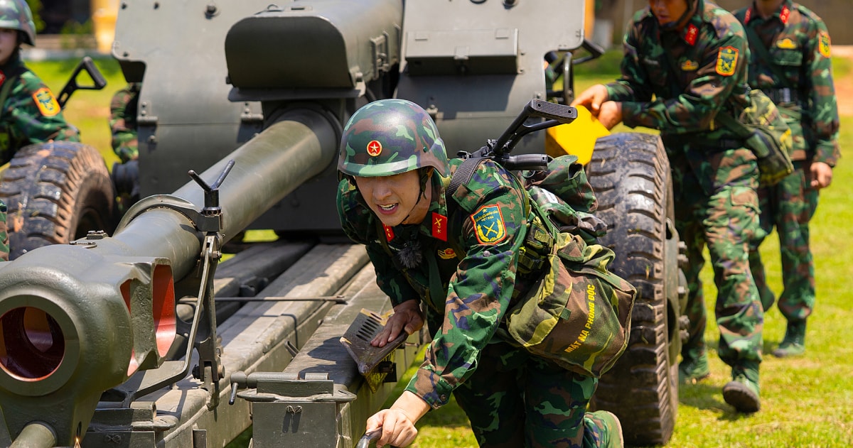 Các nghệ sĩ kéo khẩu pháo nặng 3.200 kg, là một trong những phần huấn luyện tái hiện hình ảnh của bộ đội trong chiến dịch lịch sử Điện Biên Phủ.