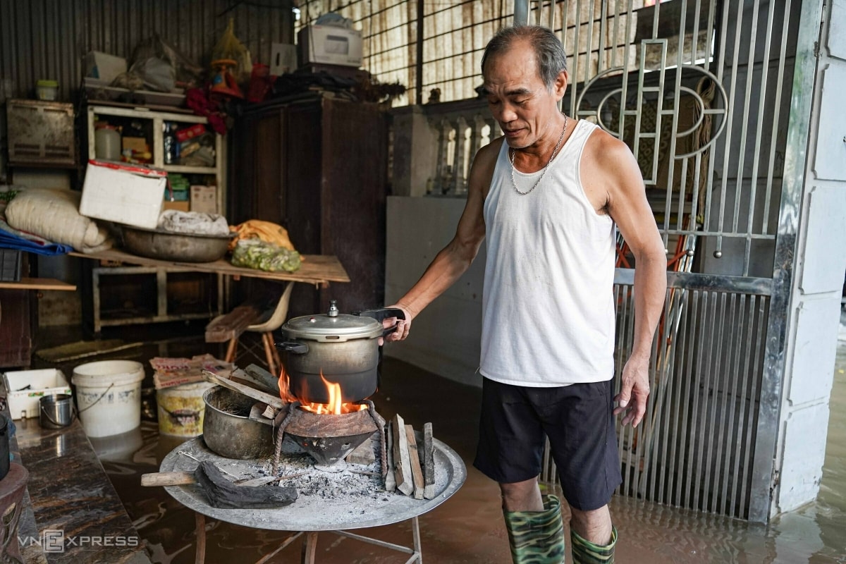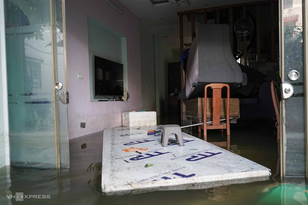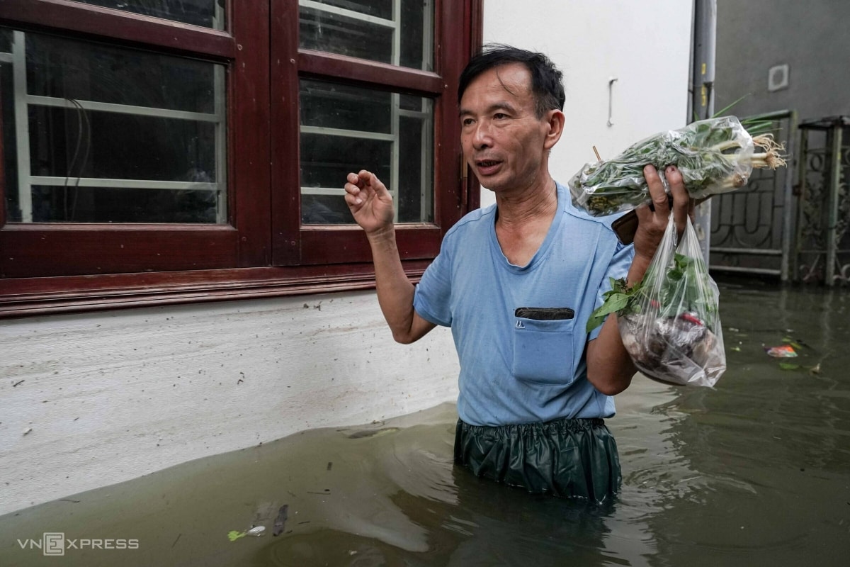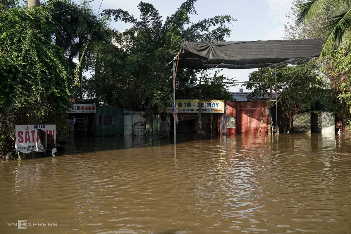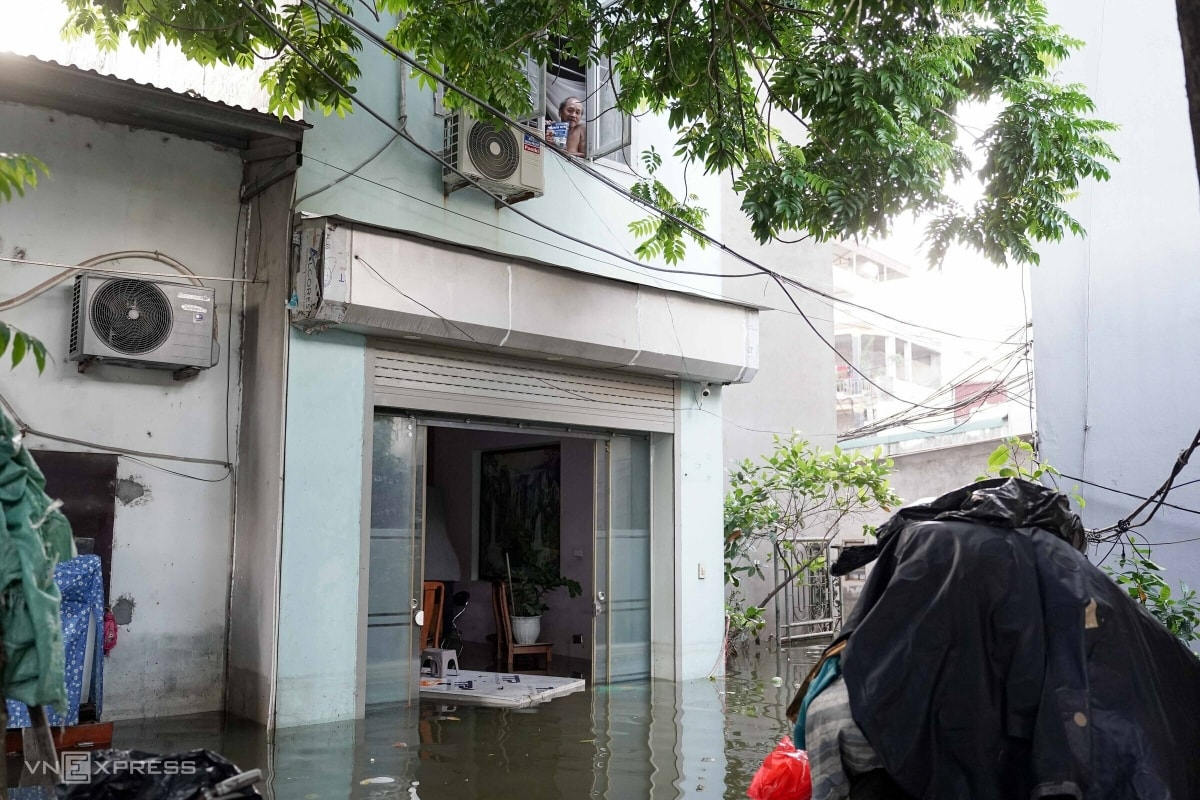 “Nước ngoài đê tràn vào, có đoạn ở cầu Ngà ngập 20–30 cm, nhiều nhà nước dâng gần quá tầng một, mất cả điện lẫn nước,” ông nói.