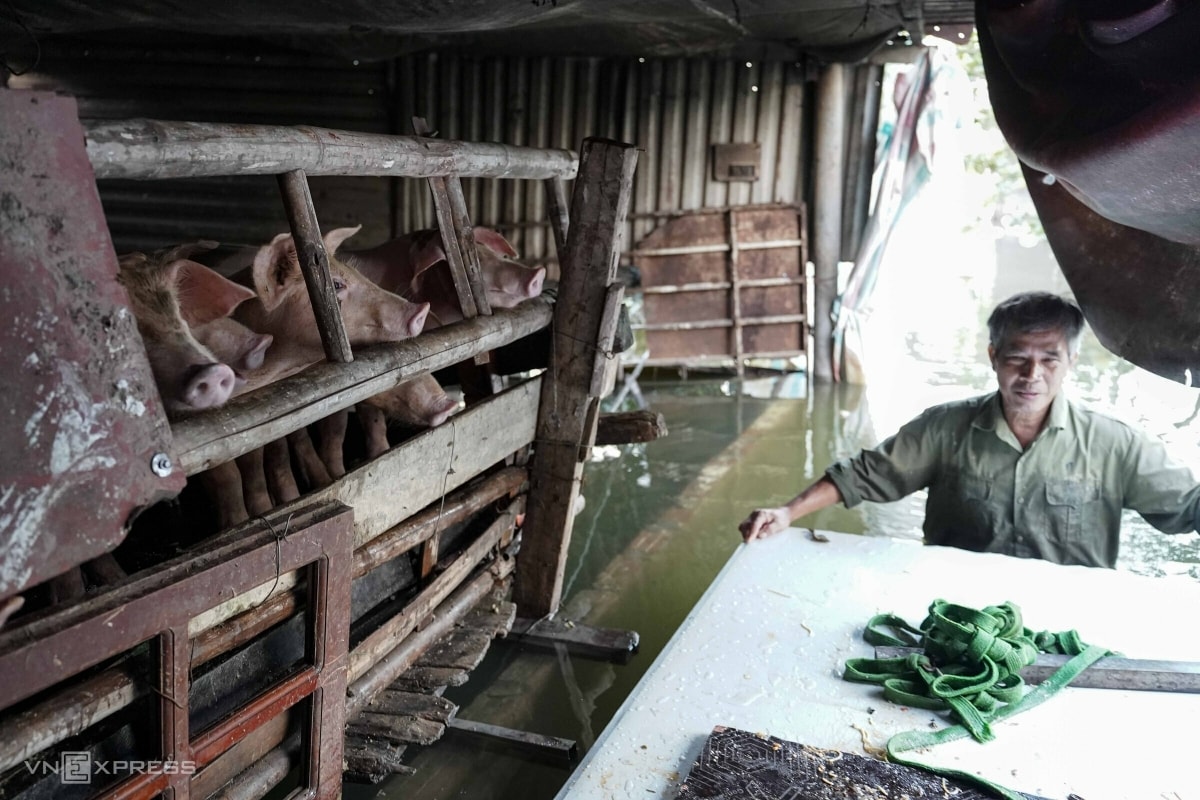 Chuồng lợn nhà ông Nguyễn Văn Bình có khoảng 20 con, được sơ tán lên cao. Do nước sâu và mất điện, không thể đun bếp củi, mỗi ngày gia đình ông phải dùng một bình gas để nấu cám.