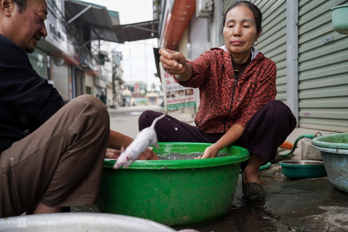Cách chợ thôn Canh Nậu 2 khoảng 200 m, vợ chồng ông Đỗ Hữu Lại đang bày một chậu lớn thịt chuột chờ làm sạch. Người làng nói ông Lại là tay săn chuột có tiếng thời trẻ.