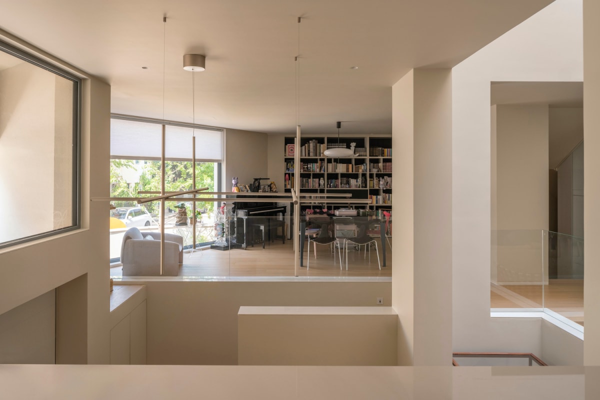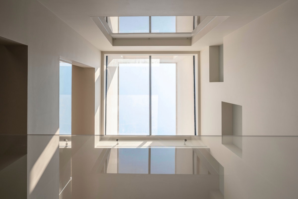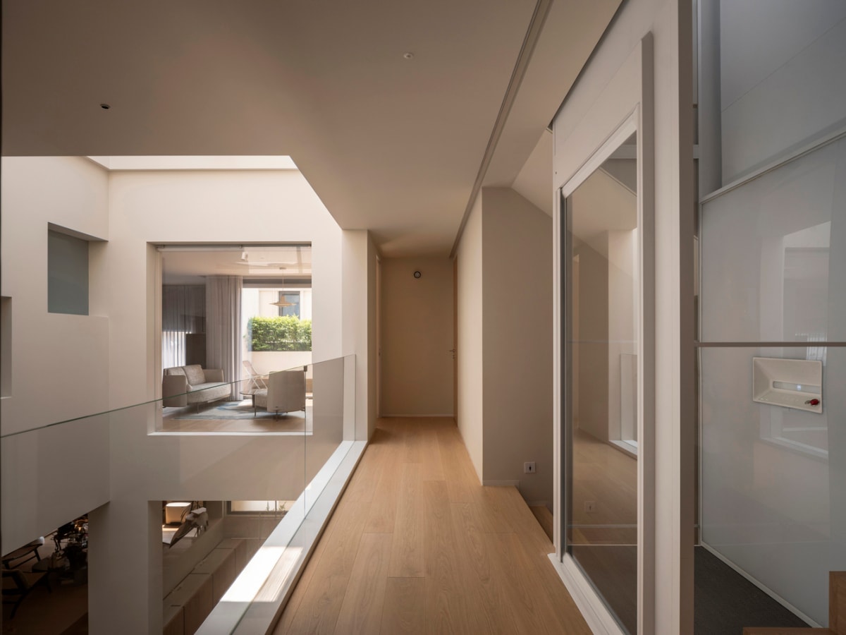 Công trình bố trí giếng trời ở lõi nhà, kết hợp hệ cửa sổ và mái kính để đưa ánh sáng tự nhiên lan tỏa vào toàn bộ không gian sống.
