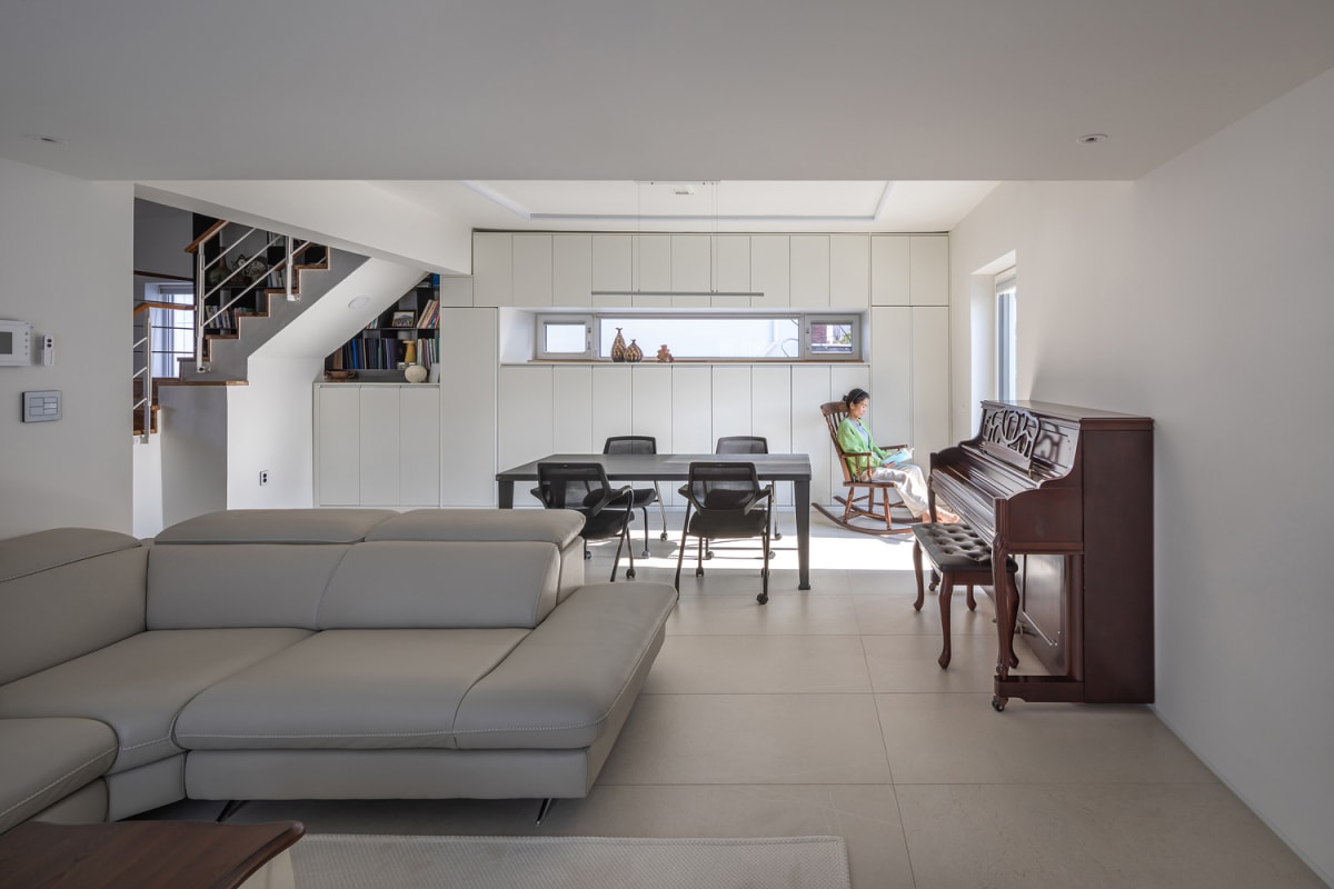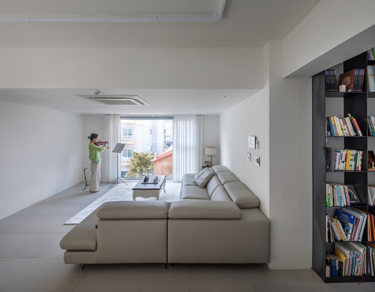 Căn nhà được cải tạo từ văn phòng cũ, giữ lại khung kết cấu ba tầng nhưng thay đổi lớp vỏ, tổ chức lại công năng để phù hợp nhu cầu sinh hoạt của một cặp vợ chồng.