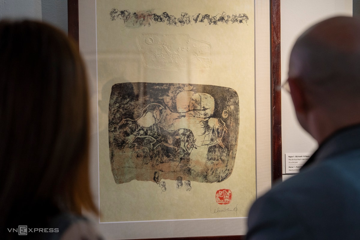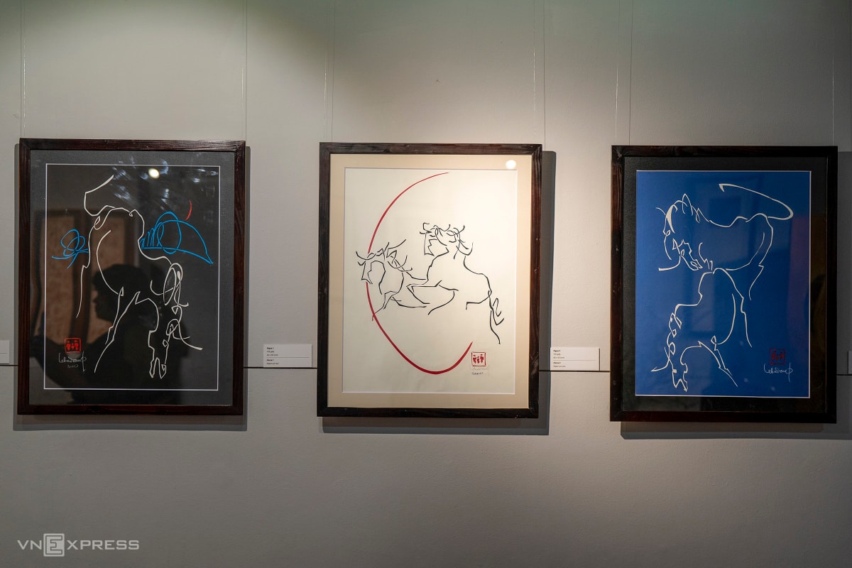 Hai tác phẩm Ngựa xiếc4 và 5, thủ ấn họa thạch bản trên giấy cứng, trưng bày tại triển lãm.