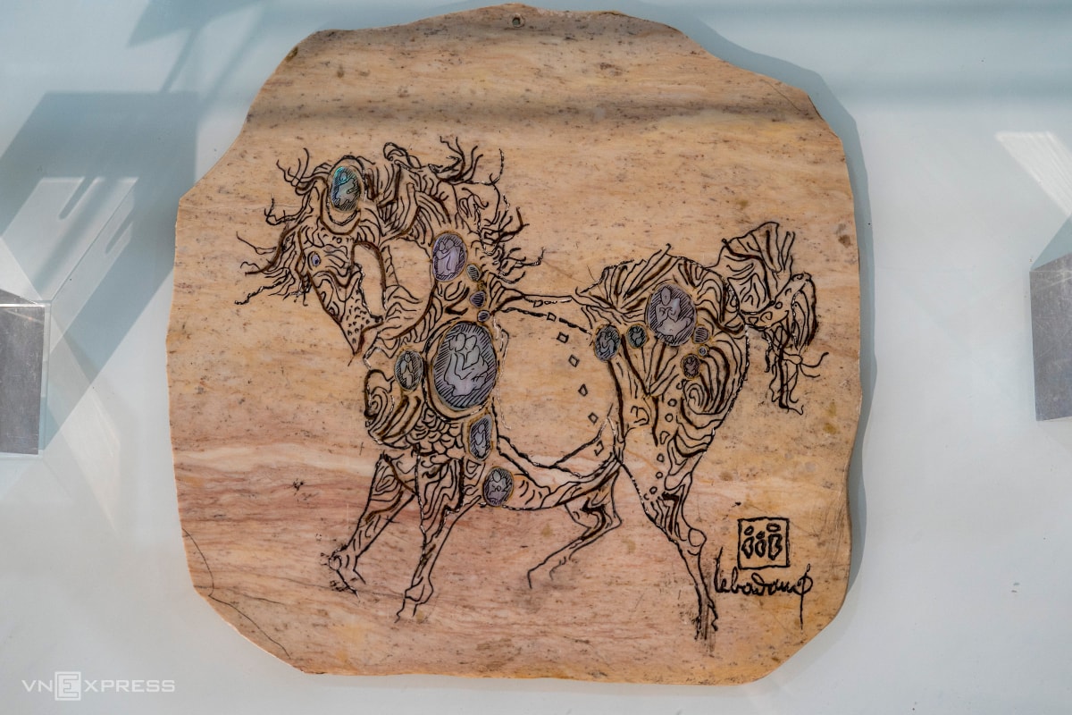 Tác phẩm ngựa khắc trên đá khảm xà cừ, kích thước 25x20cm.