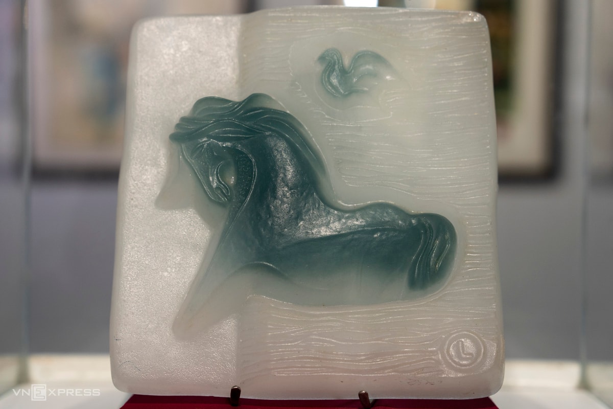 Tác phẩm Ngựa và chim trên chất liệu thủy tinh, kích thước 27x26x5 cm. Ngoài ra còn nhiều tác phẩm ngựa khắc trên chất liệu gỗ.