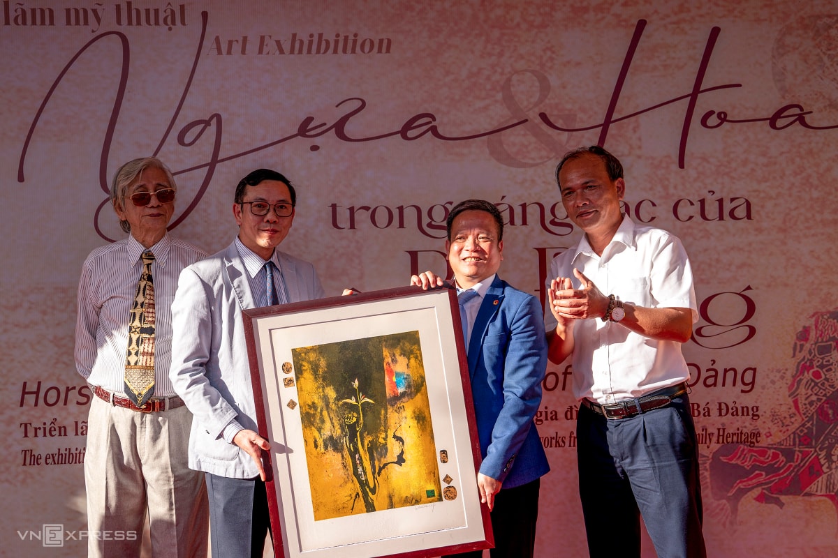 Nhân dịp khai mạc triển lãm, ông Lê Hồng Phương (thứ hai từ trái sang) - chủ sở hữu Di sản gia đình họa sĩ Lê Bá Đảng - hiến tặng 16 tác phẩm cho Bảo tàng Mỹ thuật Đà Nẵng.