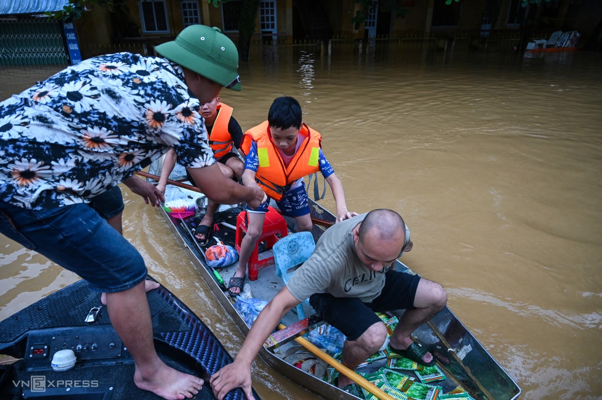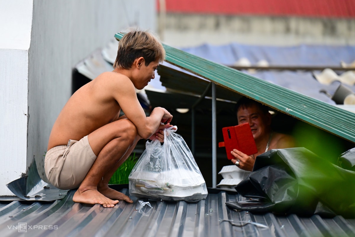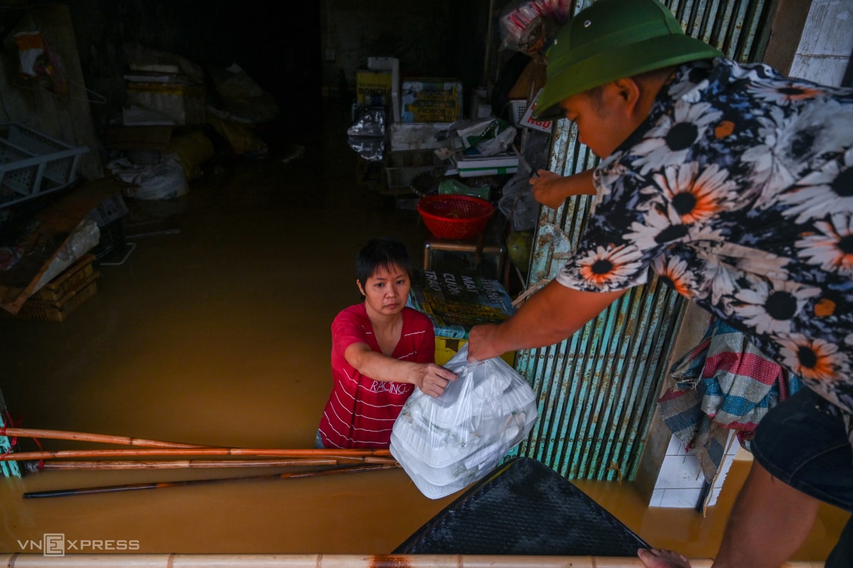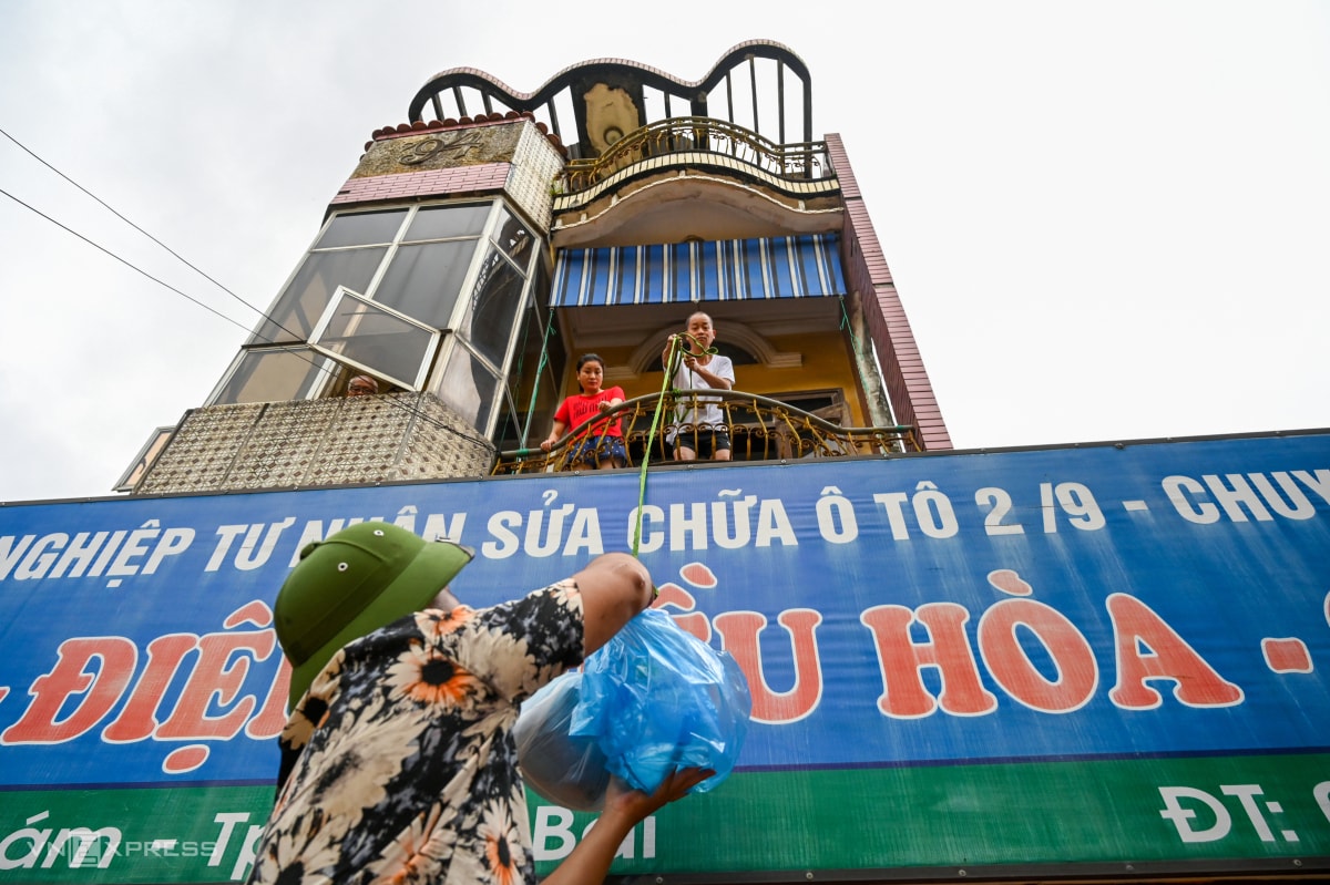 Nước ngập hết tầng một, người dân trụ lại trên các tầng cao ròng dây nhận đồ tiếp tế, di tản người già, trẻ con khi nhà mất điện.