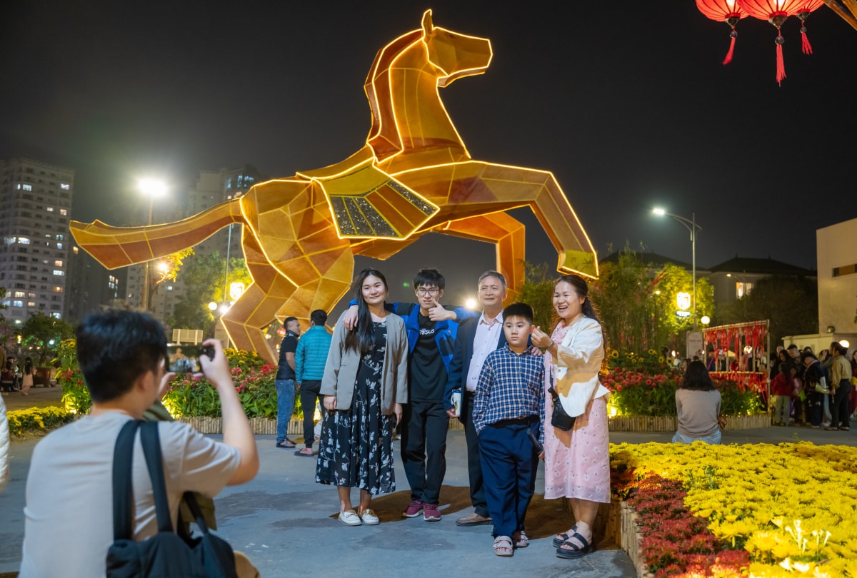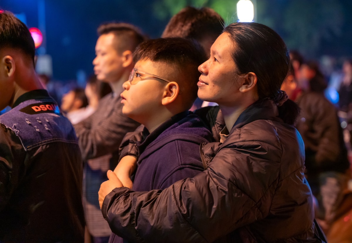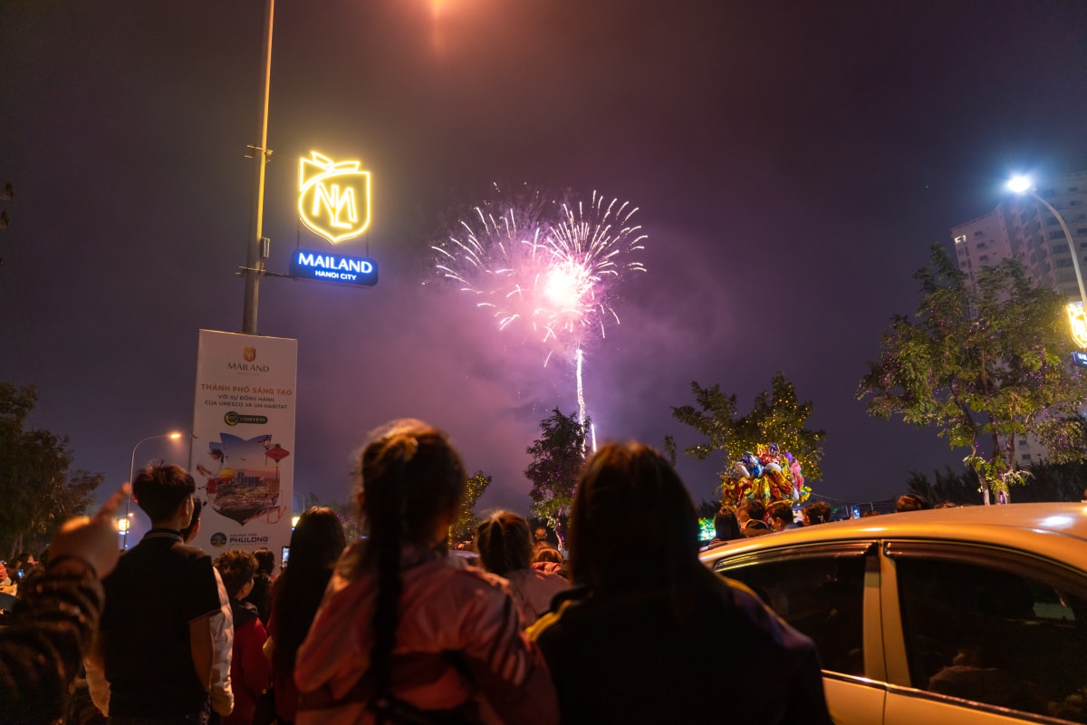 Hàng nghìn người dân xã An Khánh, Sơn Đồng, phường Tây Mỗ và khu vực lân cận đổ về khu đô thị Mailand Hanoi City vui chơi, chụp ảnh đợi pháo hoa rực rỡ trong thời khắc giao thừa.