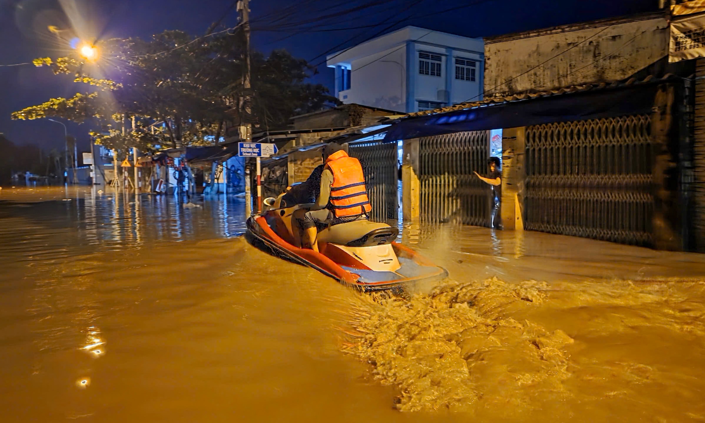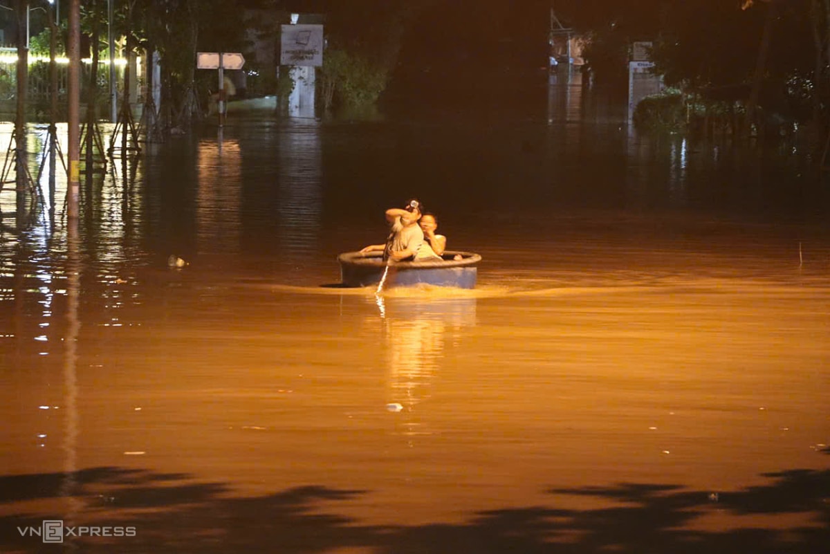 Nước dâng cao khiến nhiều khu vực ở phường Phú Thủy ngập sâu. Người dân dùng thuyền thúng di chuyển trong đêm để thoát khỏi ngập.