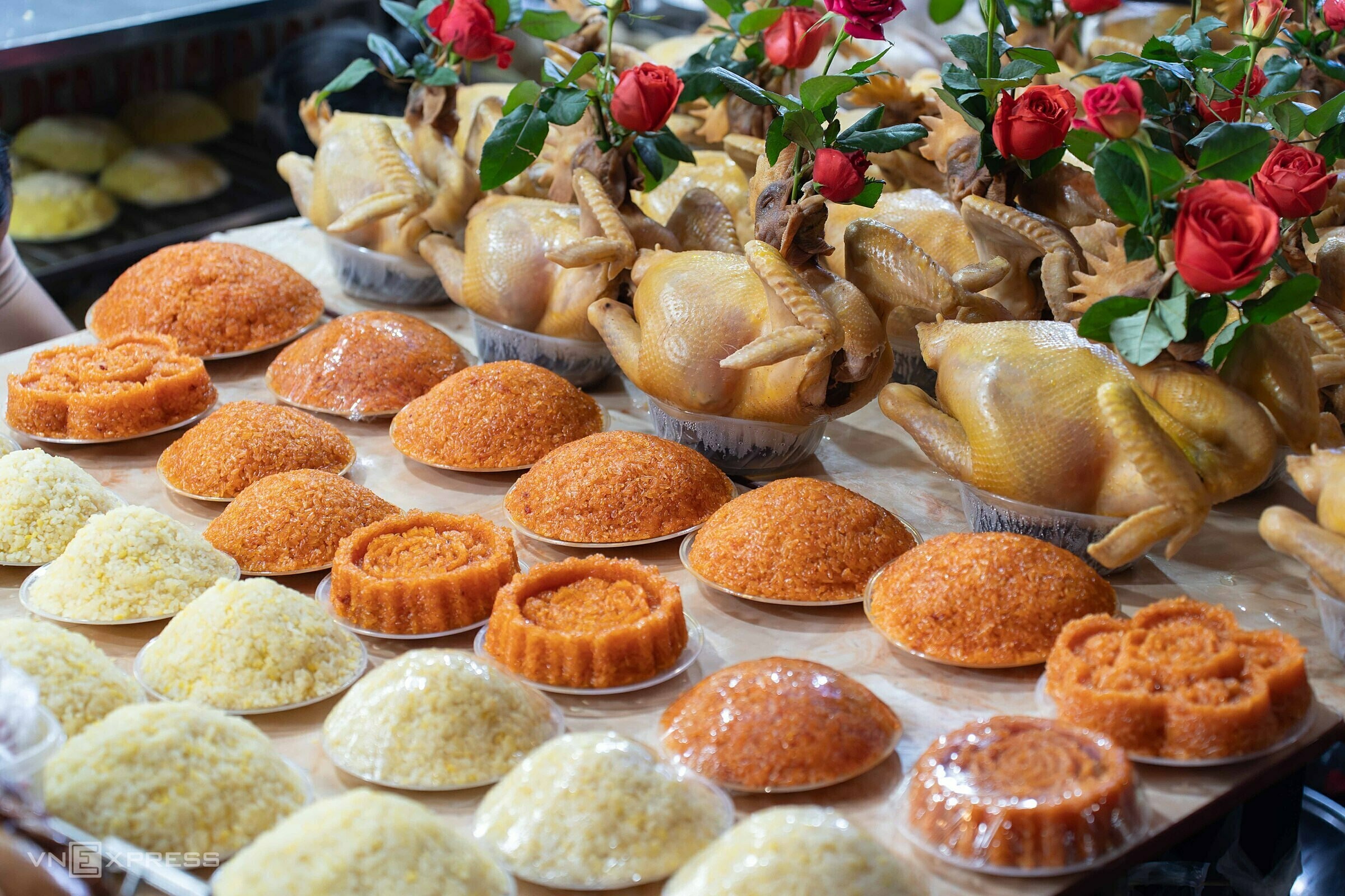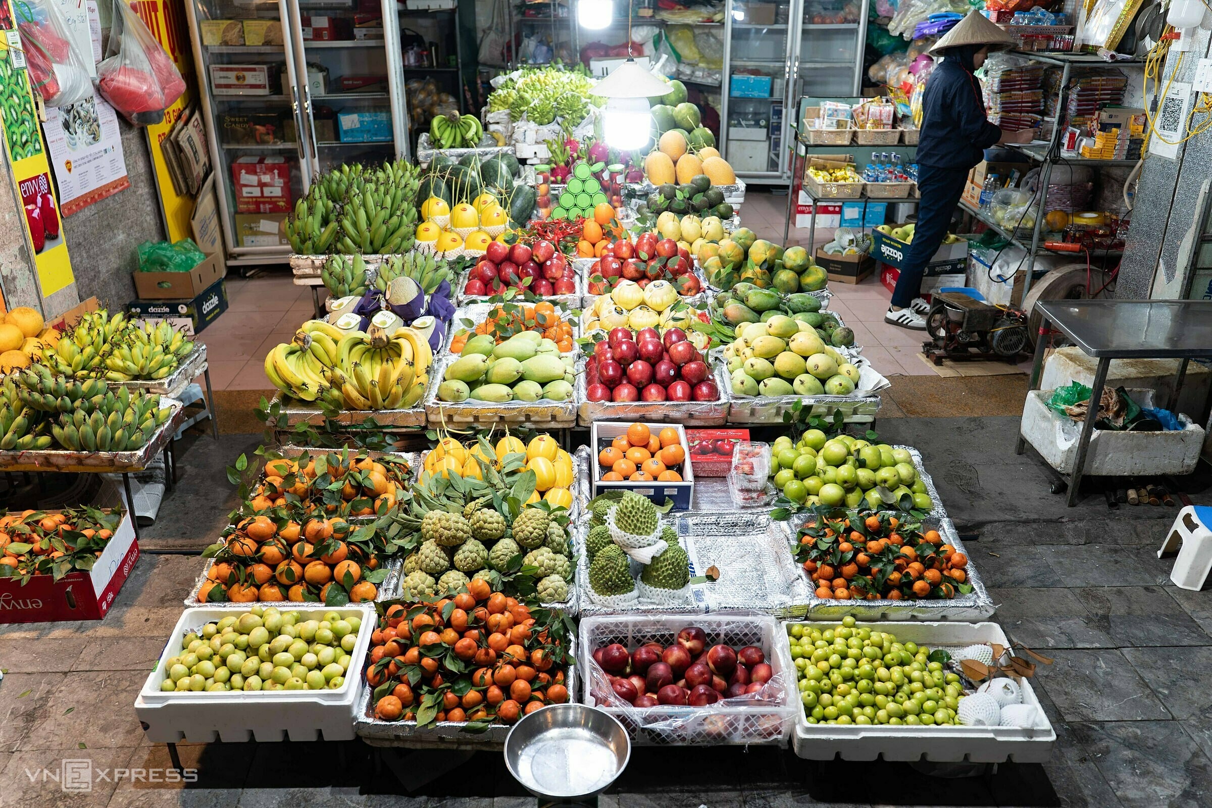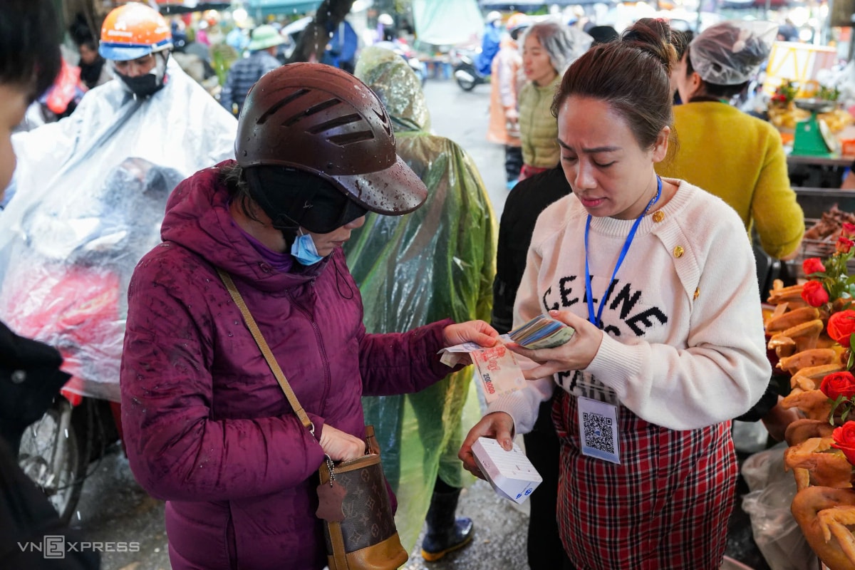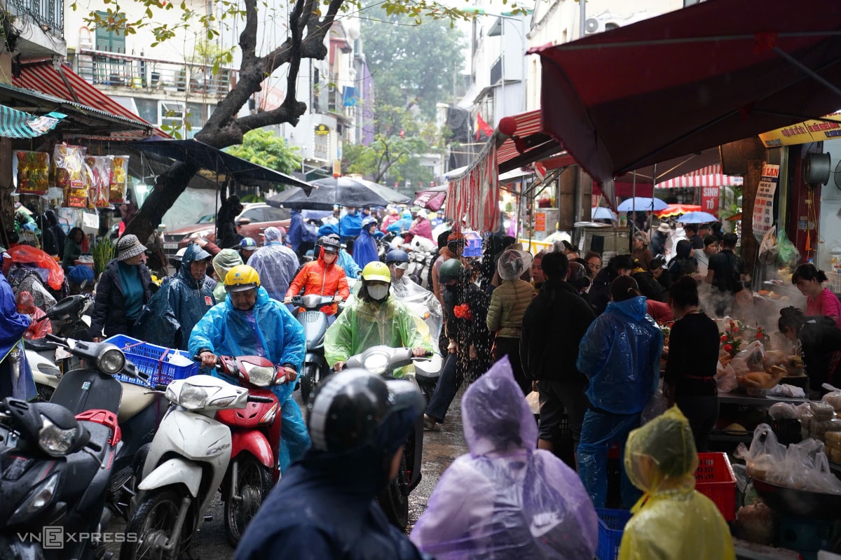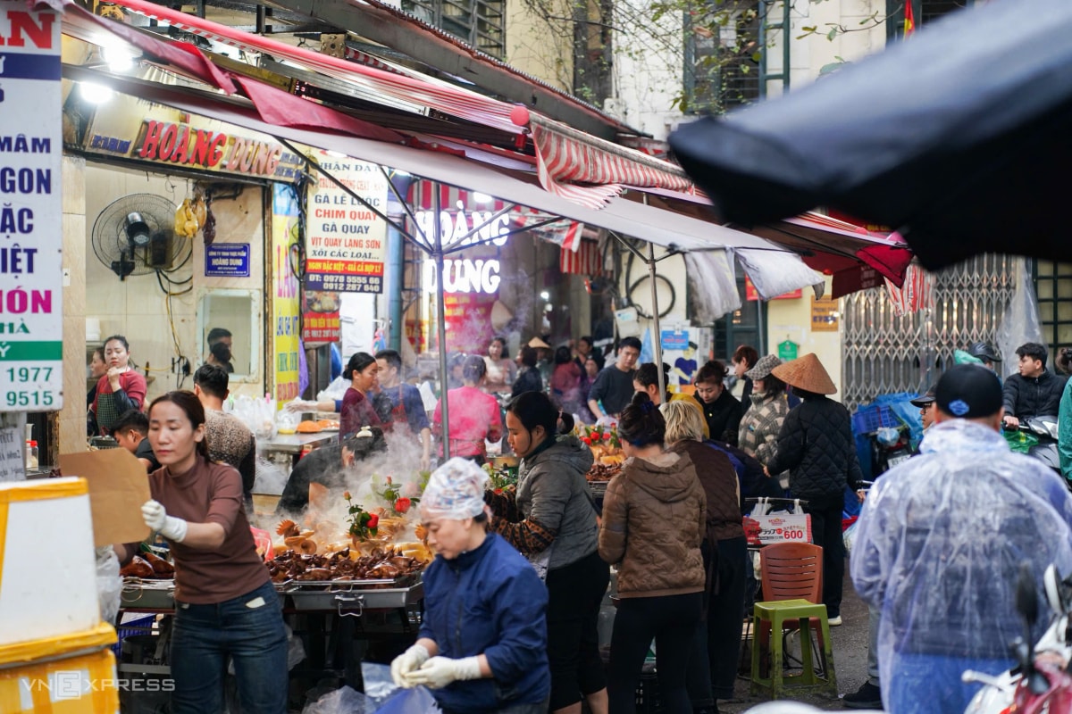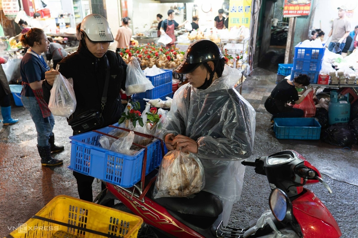Từ 5h30 sáng 22 tháng Chạp, khu chợ dân sinh trên phố Hàng Bè tấp nập người dân mua bán đồ lễ, cúng sớm.