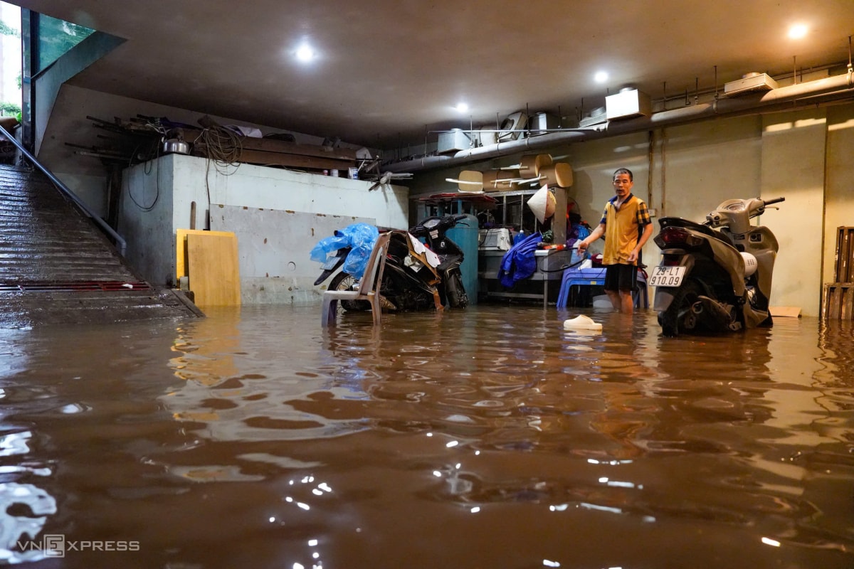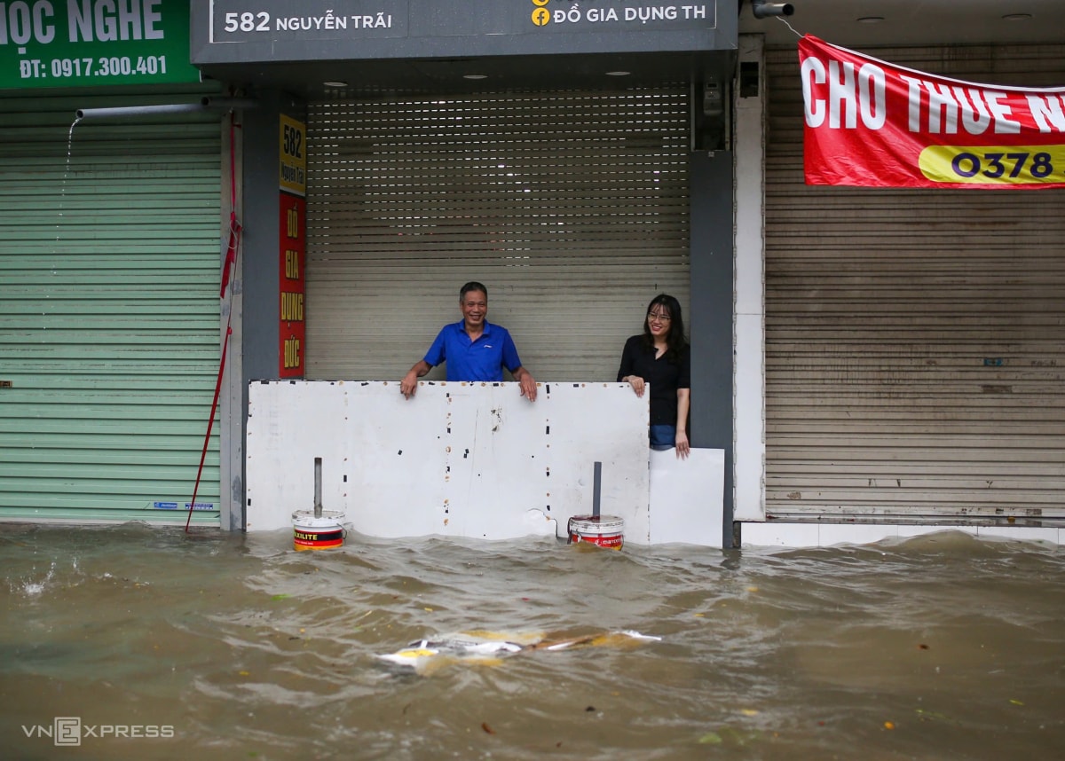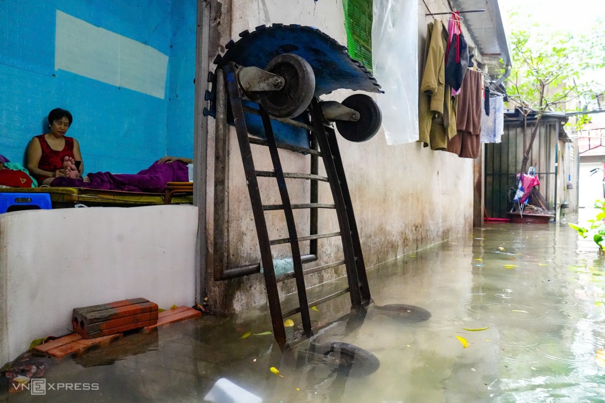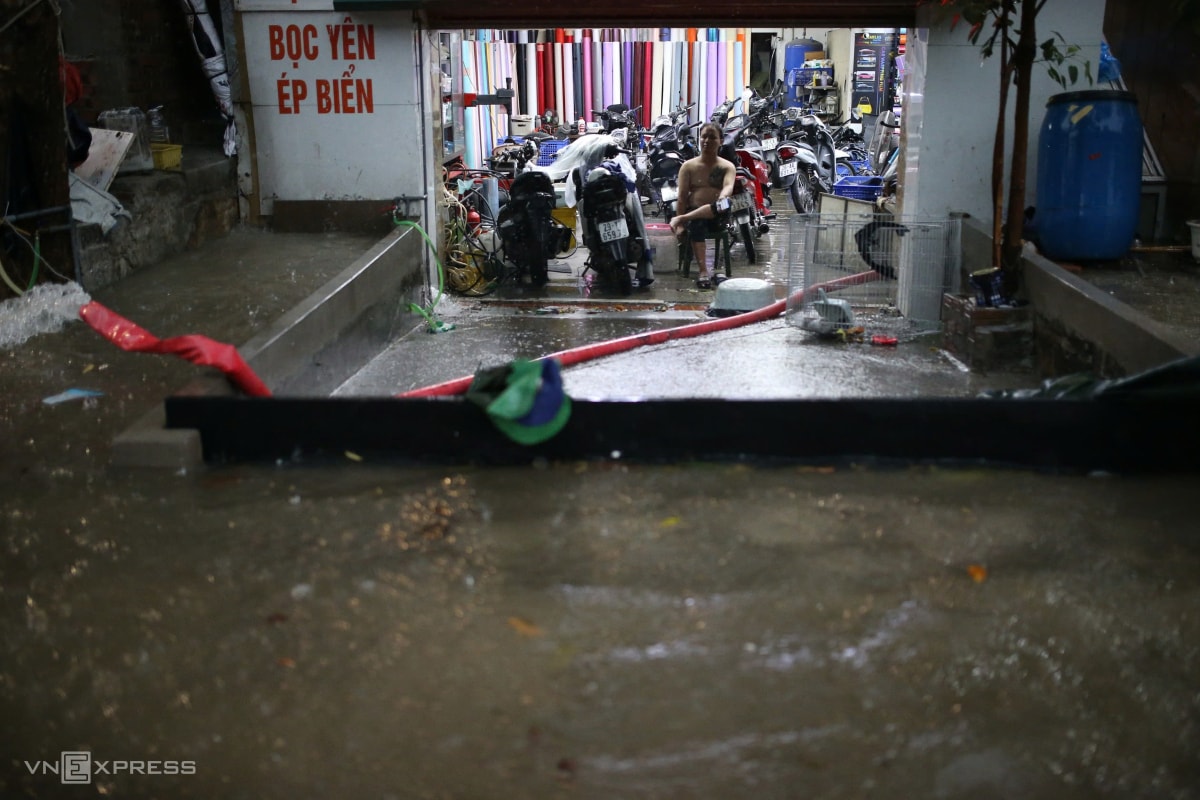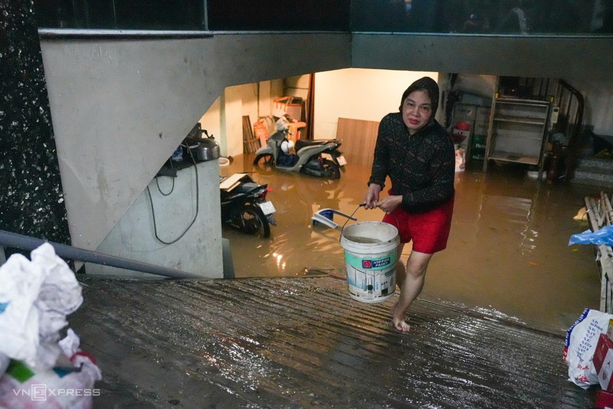 Sáng 7/10, nước tràn vào nhiều hầm nhà ở Hà Nội khiến người dân phải dùng máy bơm, xô chậu tát nước và dựng tấm chắn tạm ngăn nước tiếp tục dội vào.