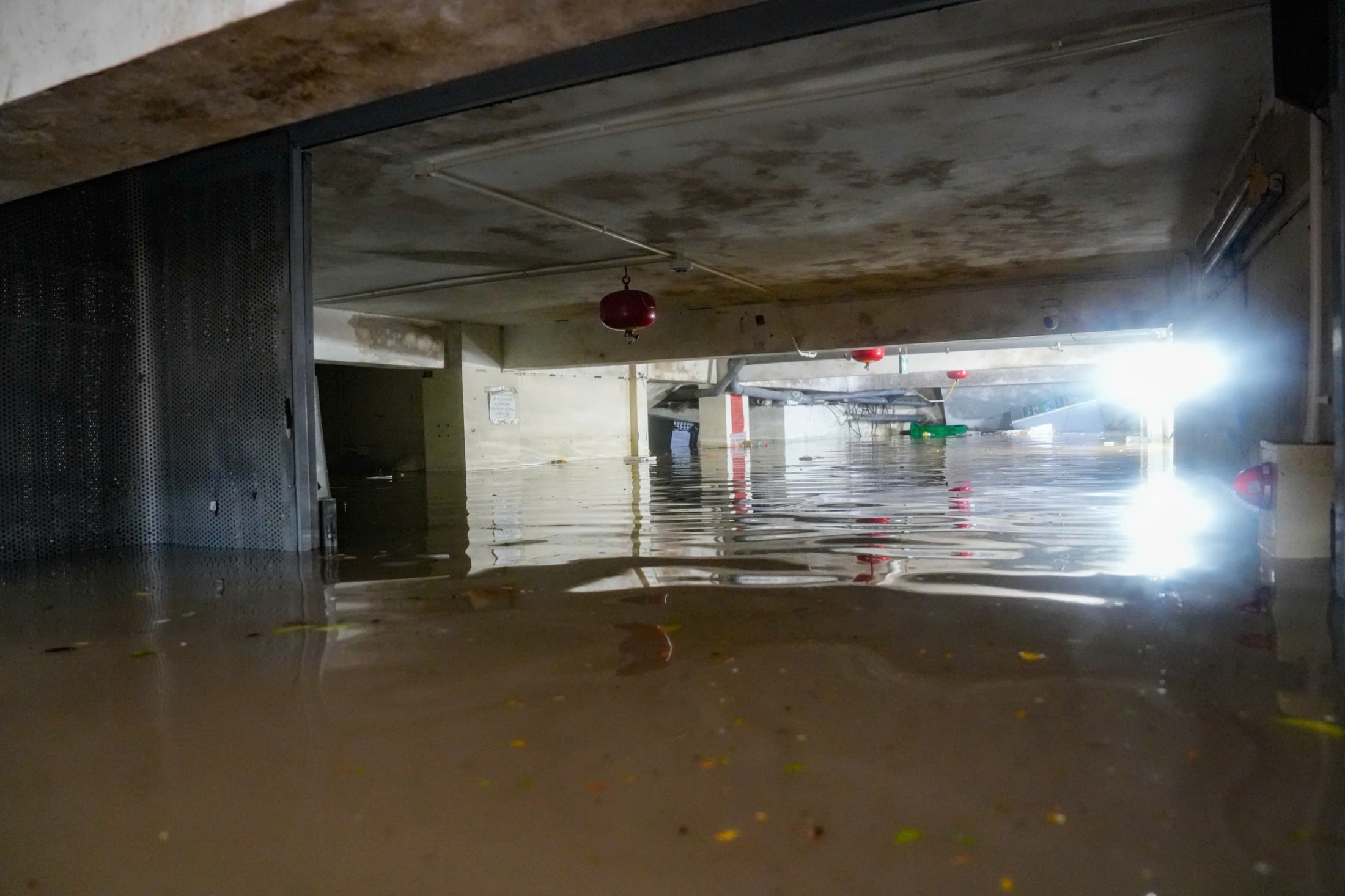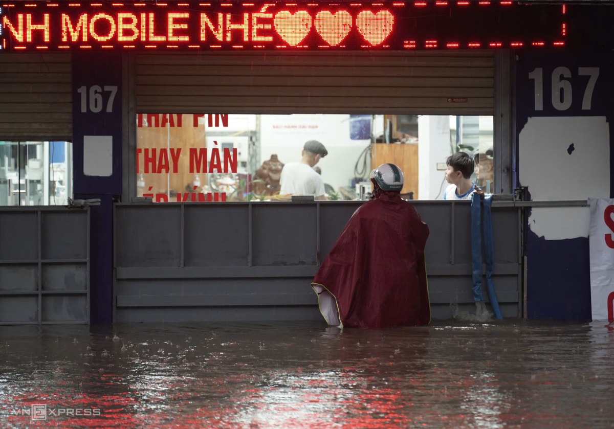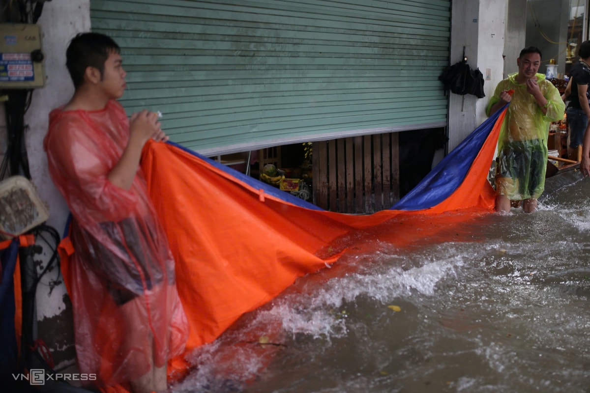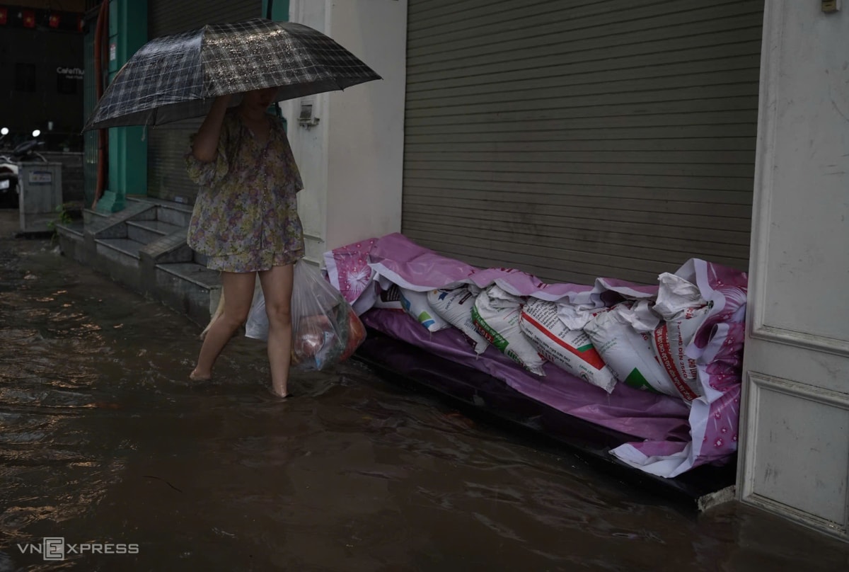 Sáng 7/10, nước tràn vào nhiều hầm nhà ở Hà Nội khiến người dân phải dùng máy bơm, xô chậu tát nước và dựng tấm chắn tạm ngăn nước tiếp tục dội vào.