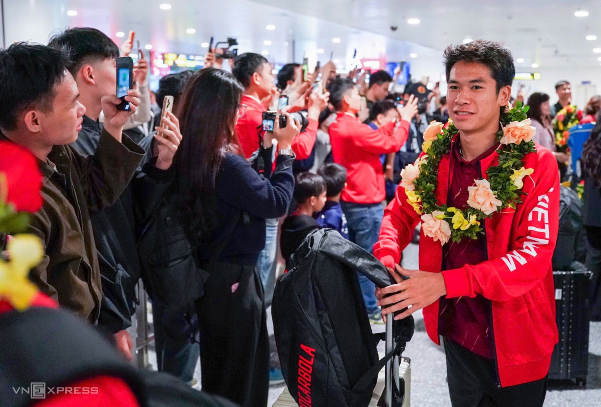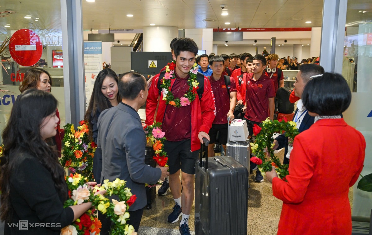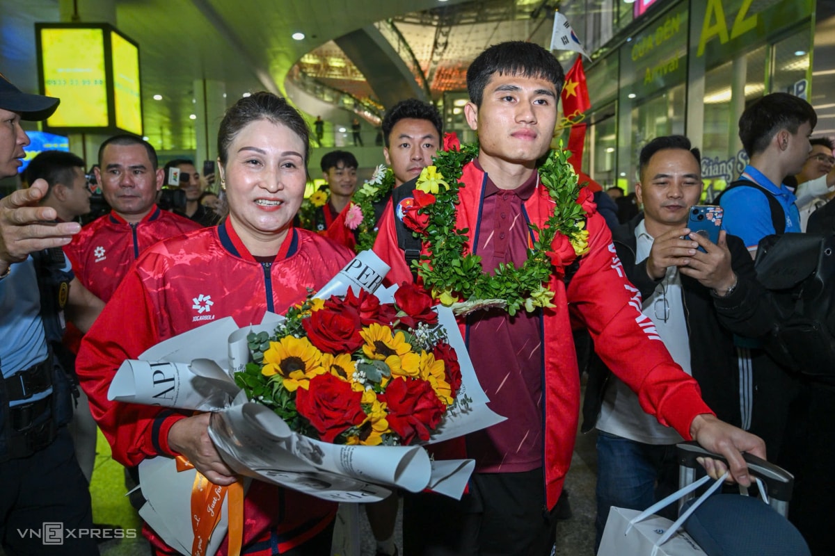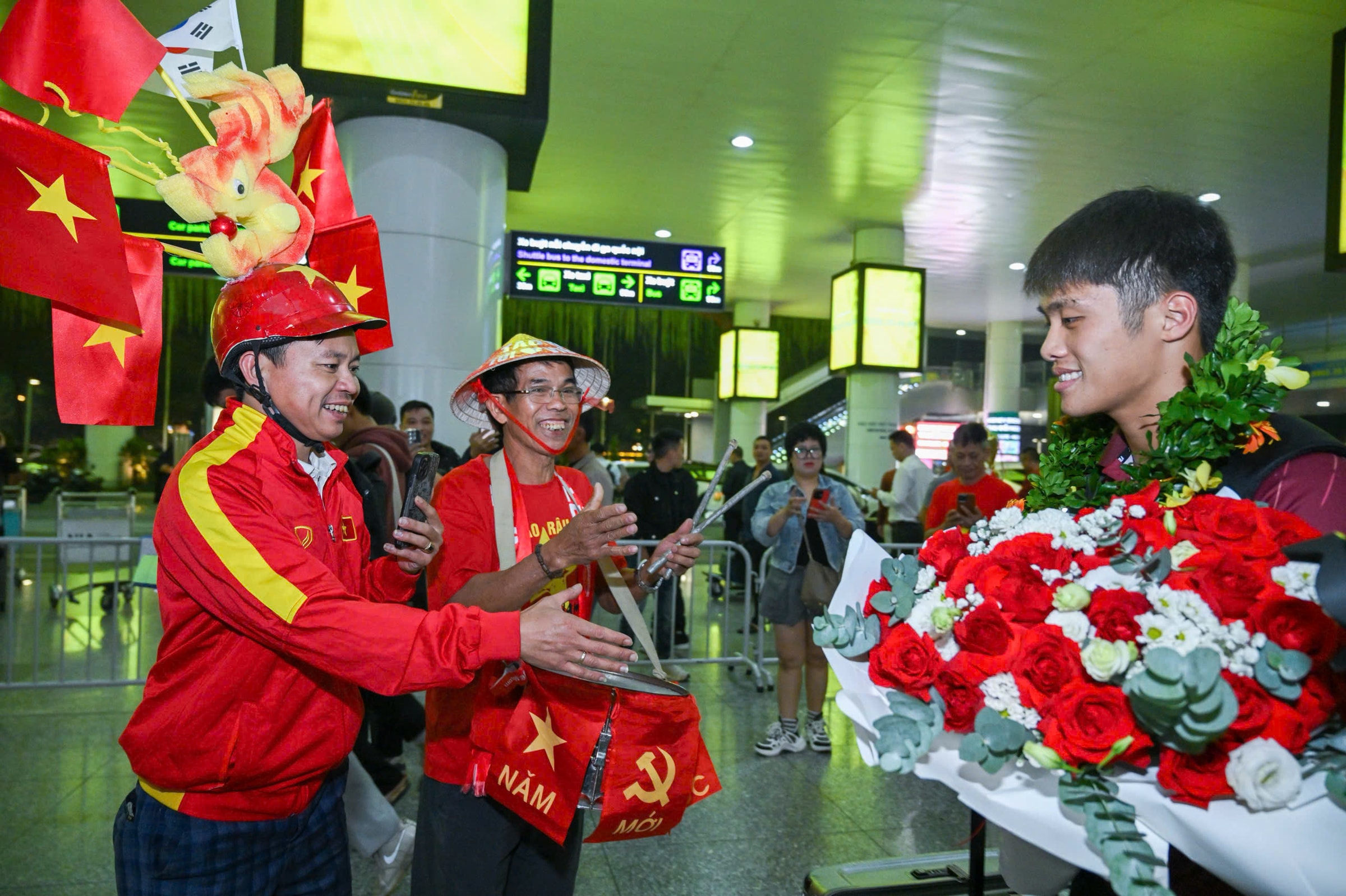 Sau khi giành HC vàng SEA Games 33, thầy trò HLV Kim Sang-sik được chào đón từ lúc lên máy bay cho đến khi rời sân bay Nội Bài ở Hà Nội vào tối nay.