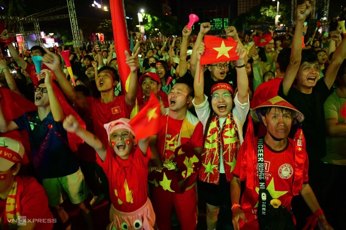 Hàng nghìn cổ động viên trên phố đi bộ Nguyễn Huệ vỡ òa cảm xúc khi đội tuyển Việt Nam đánh bại Hàn Quốc trong loạt luân lưu đầy kịch tính ở trận tranh hạng ba.