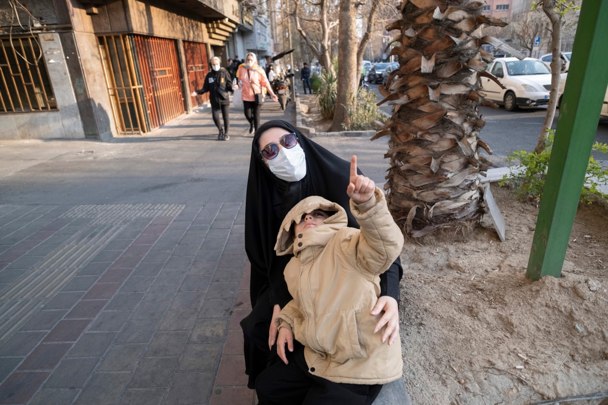 Hai mẹ con nhìn lên bầu trời khi nghe thấy tiếng tiêm kích, sau khi tham gia cuộc mít tinh ủng hộ ông Mojtaba ở Tehran.