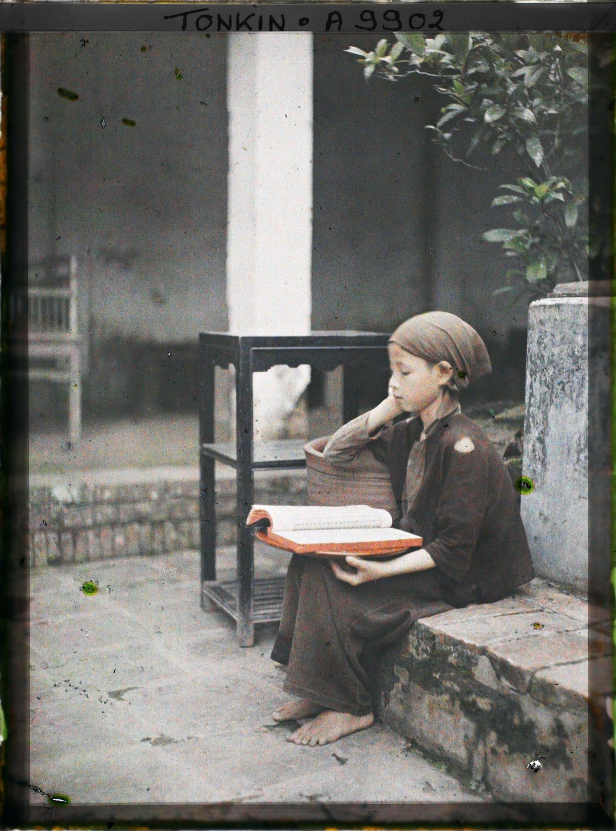 Nhiếp ảnh gia Pháp León Busy chụp nông dân làm ruộng, chú tiểu đọc kinh trong chùa Viên Minh, hơn 100 năm trước.