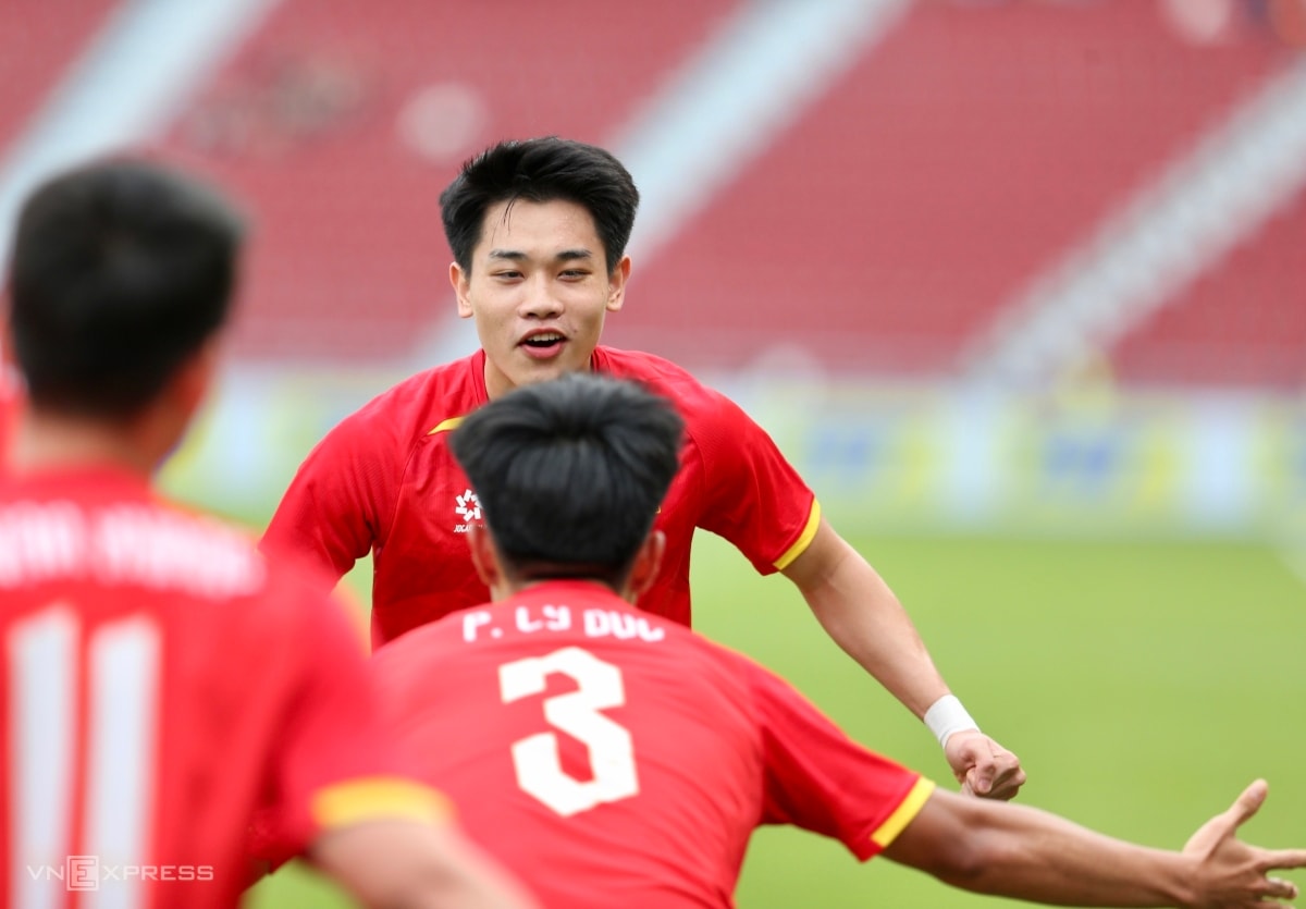 Minh Phúc giang hai tay ăn mừng. Ở trận thắng Lào, chính anh là người căng ngang cho Đình Bắc mở tỷ số. Một sự kết hợp tốt của hai cầu thủ thuộc CLB Công an Hà Nội.
