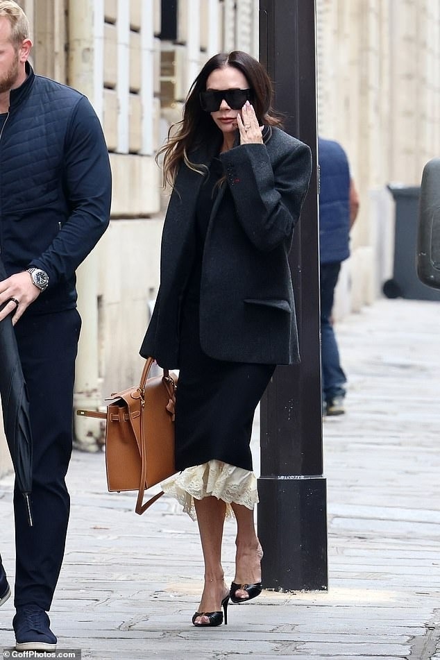Harper diện đầm quây ngực, sánh bước bên bố David Beckham và các anh trai khi tới Paris Fashion Week.