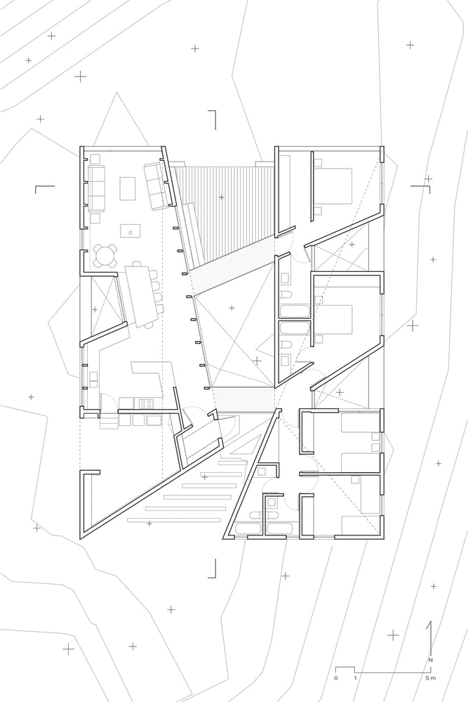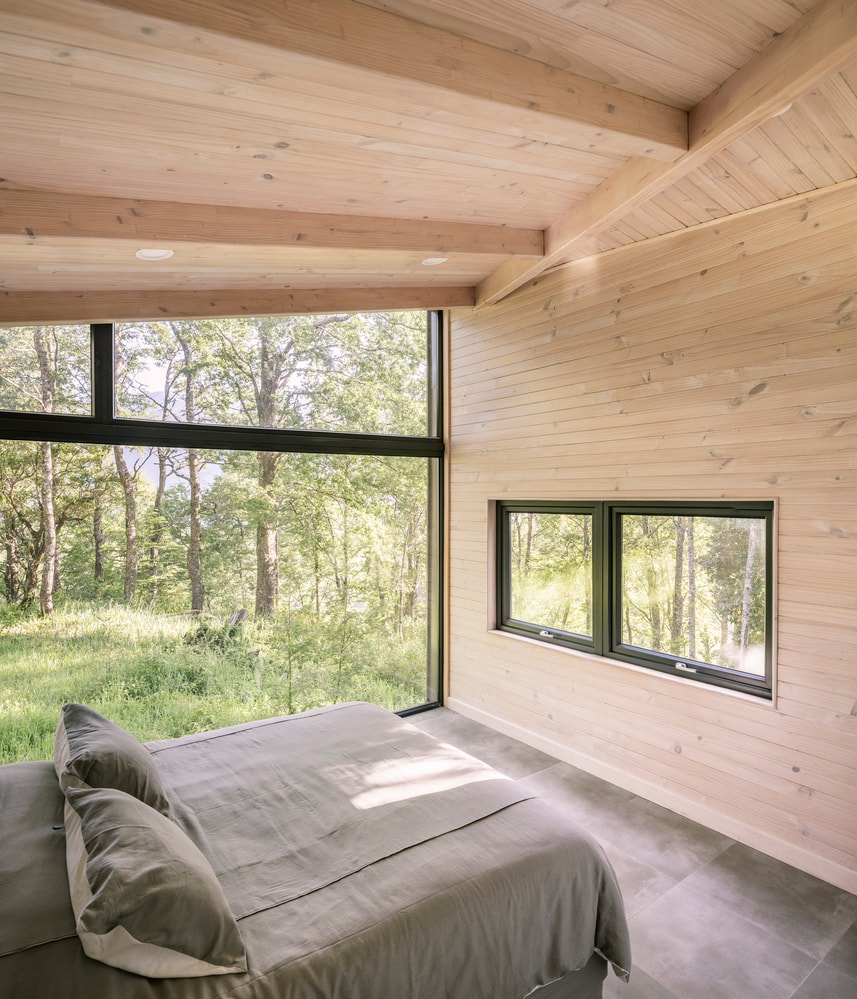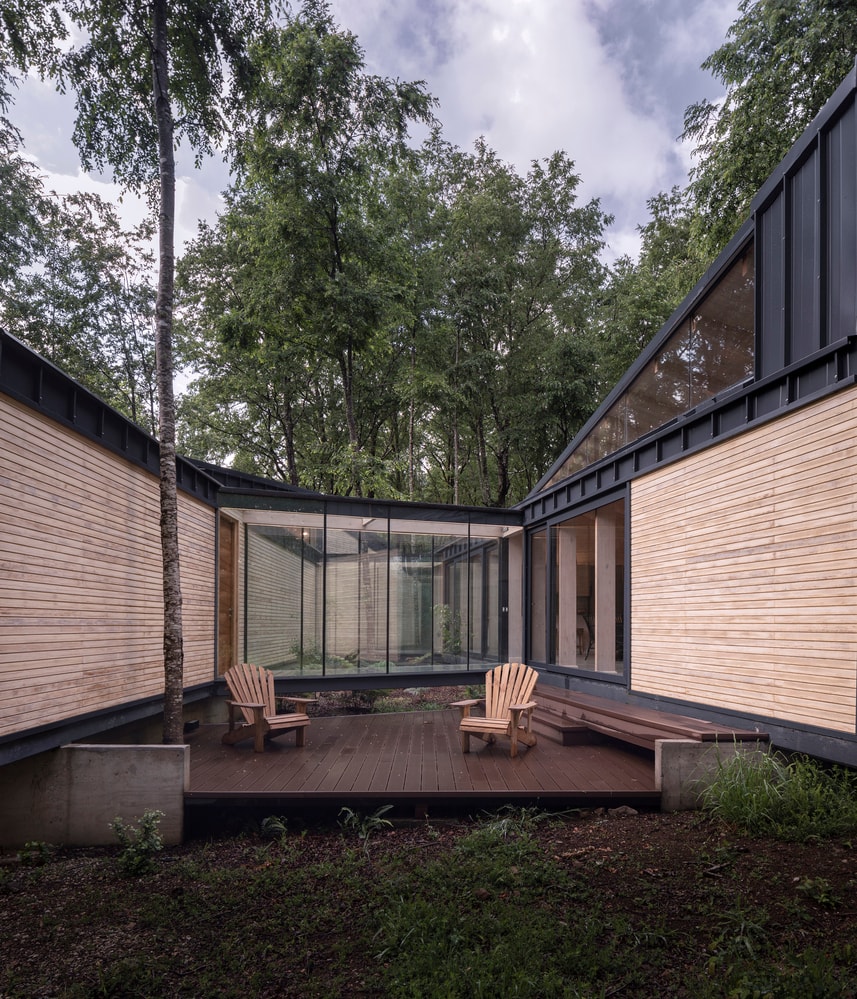 Ngôi nhà được tổ chức thành các khối, vừa đảm bảo riêng tư, vừa mở rộng tầm nhìn và kết nối trực tiếp với cảnh quan rừng.