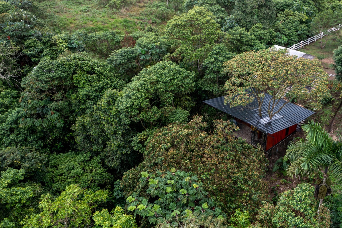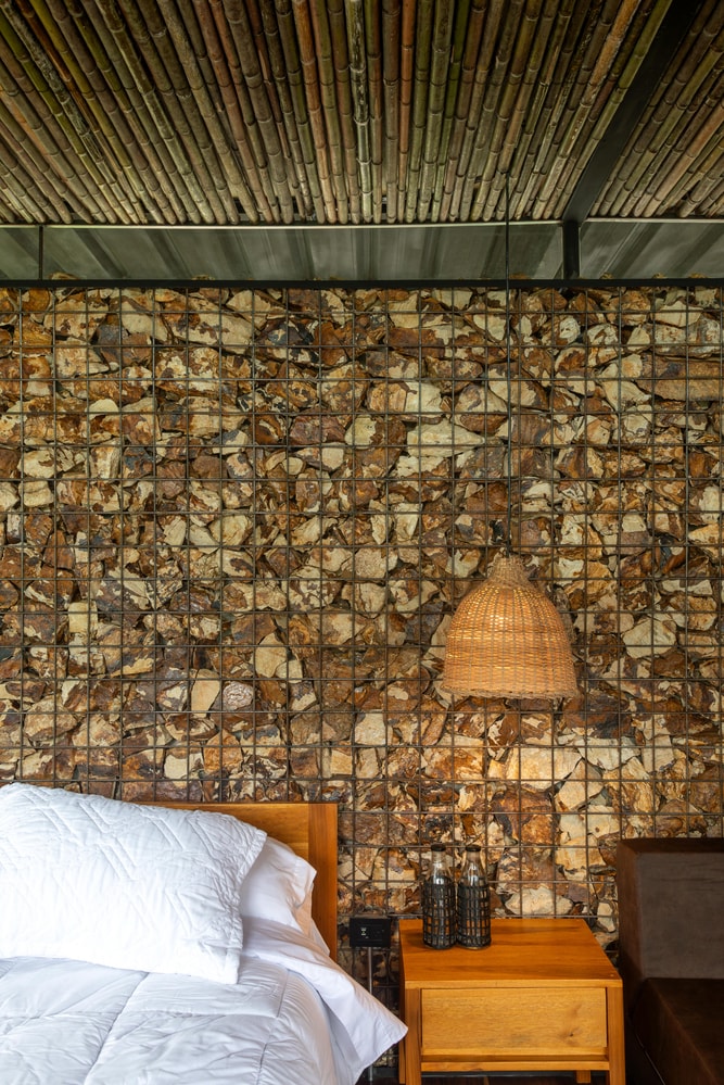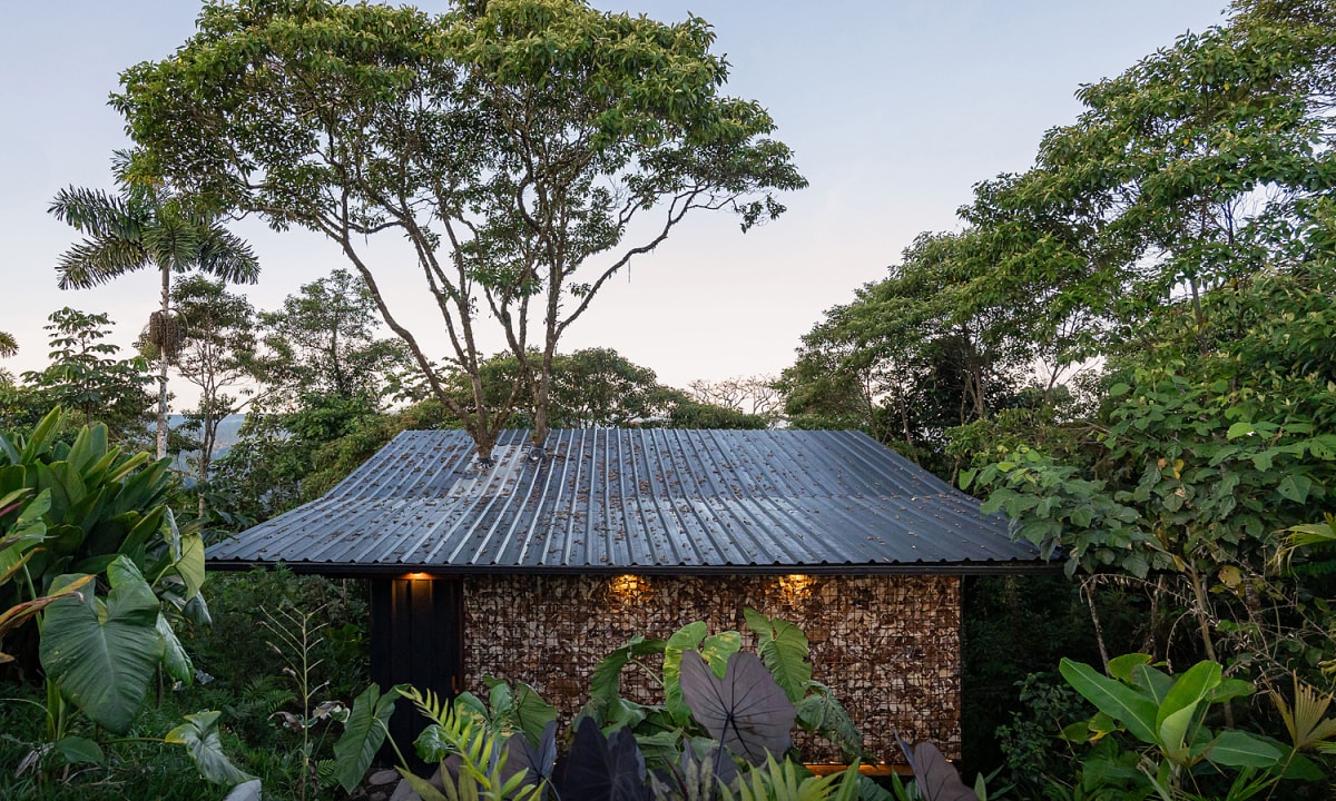 Căn nhà 45 m2 tận dụng vật liệu sẵn có như gỗ, đá, tre, ống thép tái chế để xây dựng trên khu đất rừng, hướng đến kết nối thiên nhiên và bảo vệ hệ sinh thái.