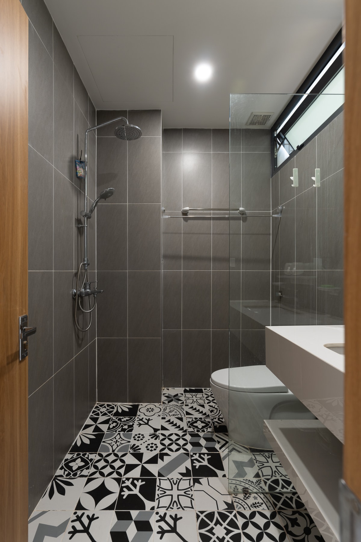 Phòng vệ sinh sử dụng gạch lát nền họa tiết đen trắng tạo điểm nhấn. Gạch ốp tường màu xám trung tính dễ vệ sinh, kết hợp cửa sổ cao lấy sáng và thông gió.