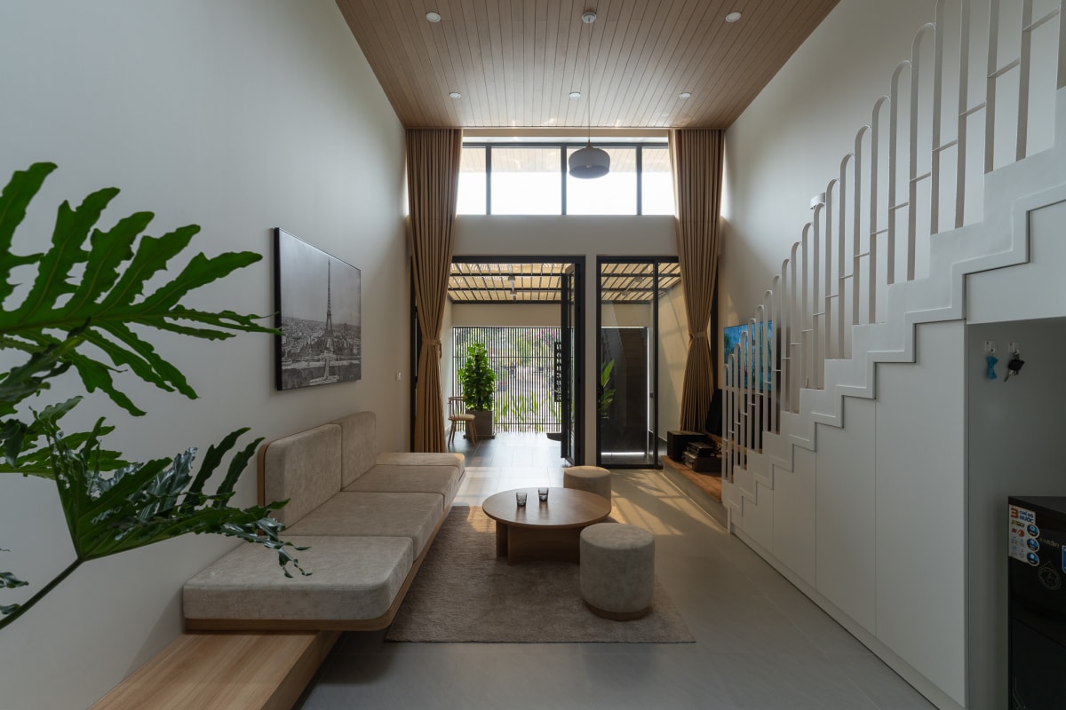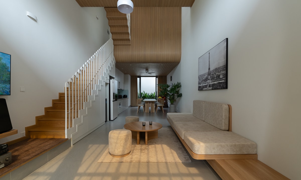 Khối nhà chính đặt giữa khu đất, tạo khoảng sân trước và sau giúp lưu thông không khí. Tầng trệt bố trí cầu thang và bếp về một phía, để lại trục thông gió giữa hai sân. Nội thất bố trí theo hướng tối giản, ưu tiên vật liệu gỗ.