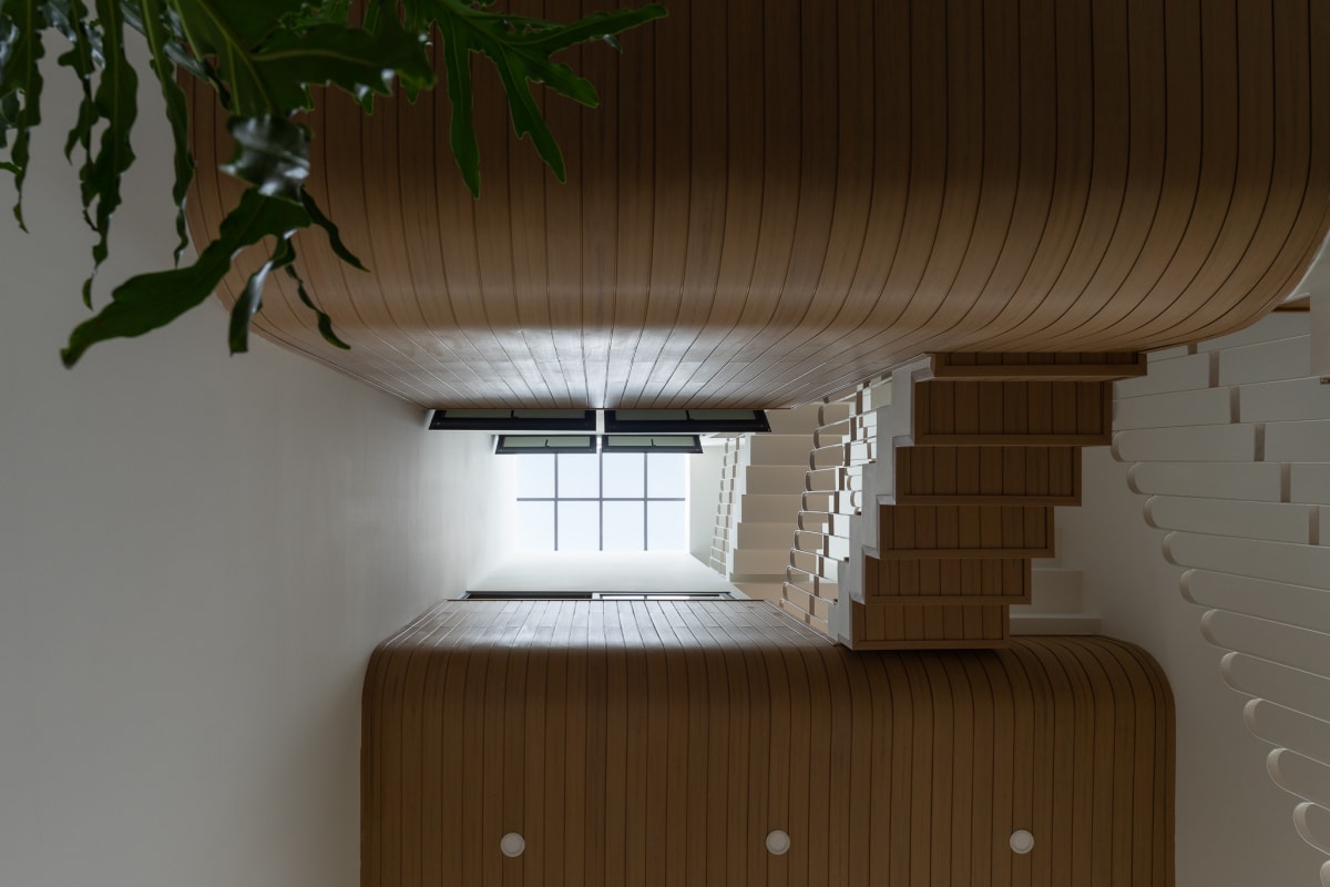 Điểm nổi bật của căn nhà là hệ trần gỗ nhân tạo uốn cong từ không gian bên trong kéo dài ra ban công, tạo liên kết thị giác liên tục.