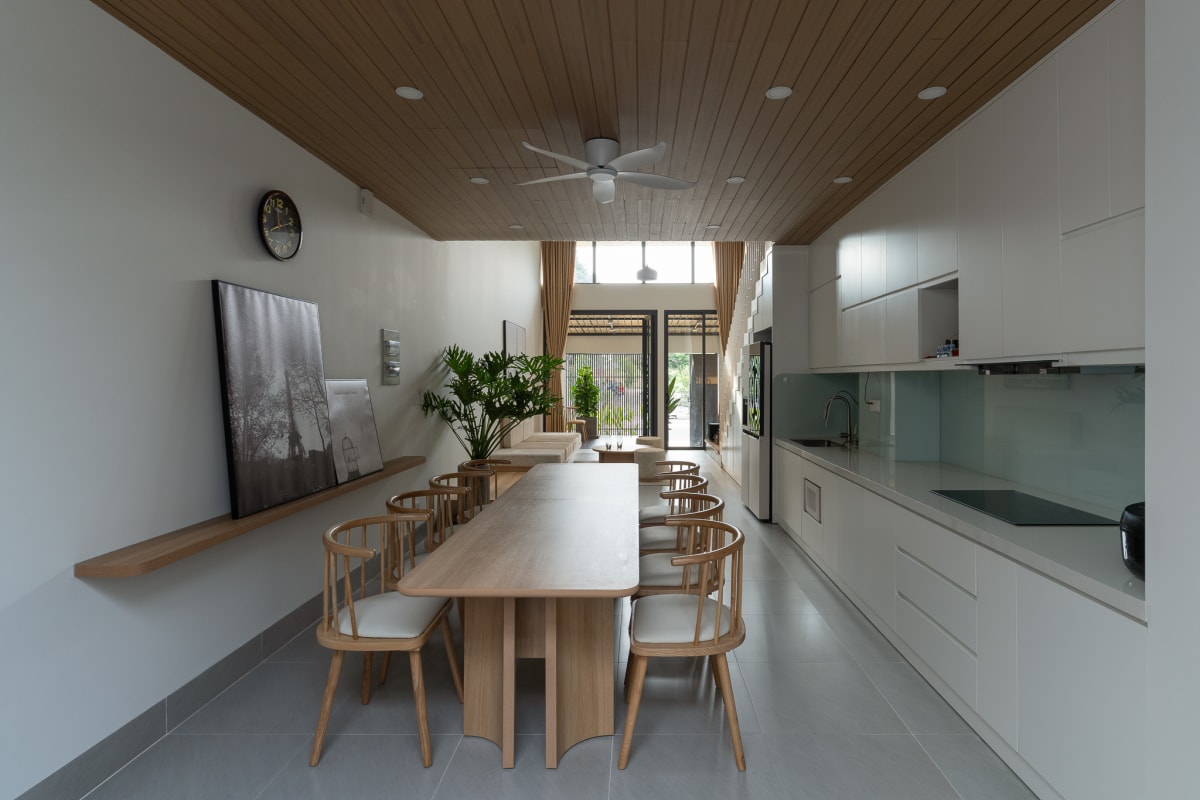 Không gian bếp và phòng ăn được bố trí liên hoàn, dọc theo chiều dài nhà nhằm tối ưu diện tích. Hệ tủ bếp thiết kế phẳng, không tay nắm, màu trắng đồng bộ với tường giúp mở rộng cảm quan thị giác. Bàn ăn và ghế gỗ đồng bộ chất liệu với trần ốp gỗ.