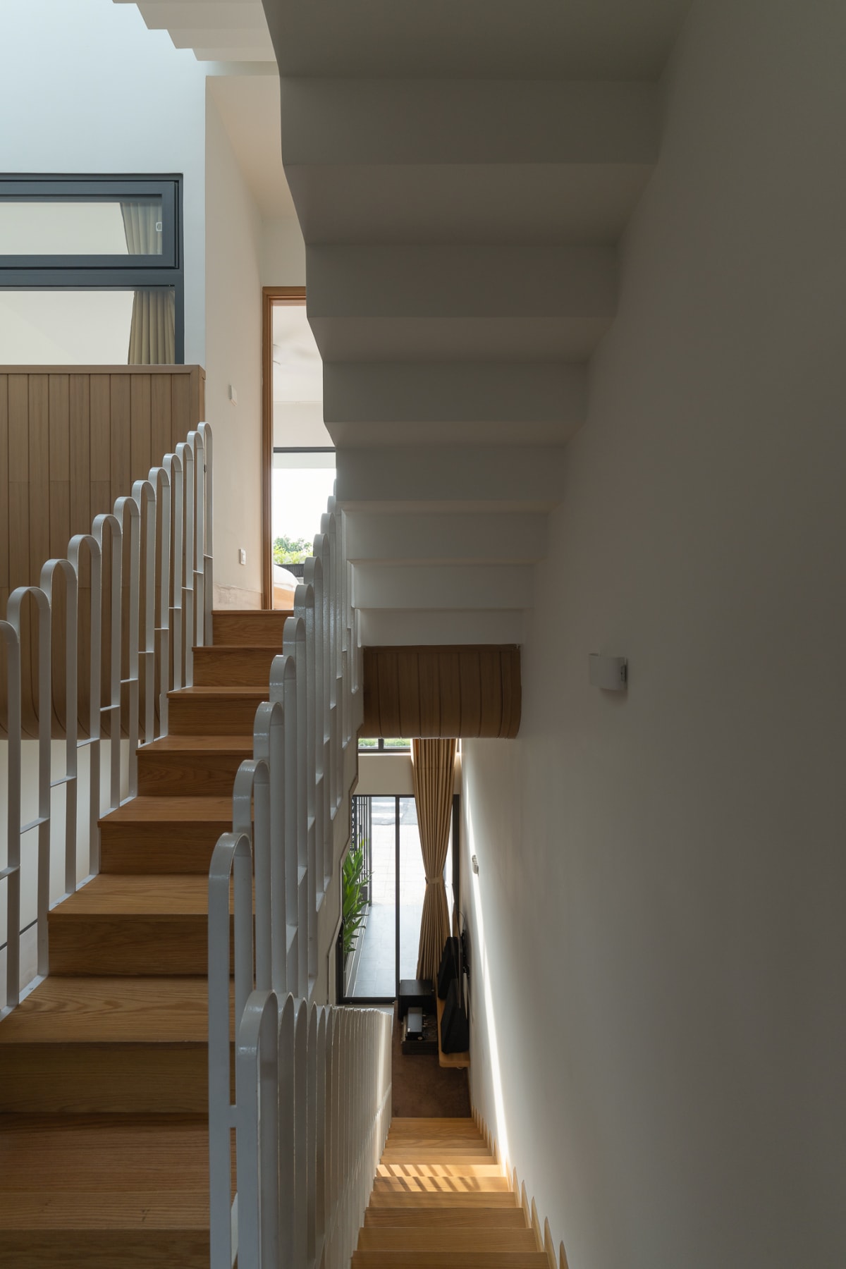 Cầu thang thiết kế lệch tầng đặt lệch về một phía, kết hợp tay vịn sắt sơn trắng tạo cảm giác nhẹ thoáng.