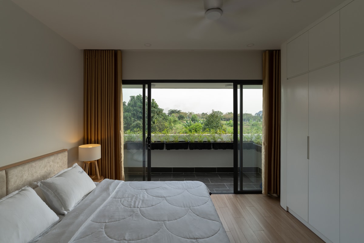 Phòng ngủ sử dụng nội thất gỗ tông sáng, kết hợp sàn gỗ đồng bộ. Cửa sổ kính lớn hướng ra bồn cây xanh, hạn chế ánh nắng trực tiếp.