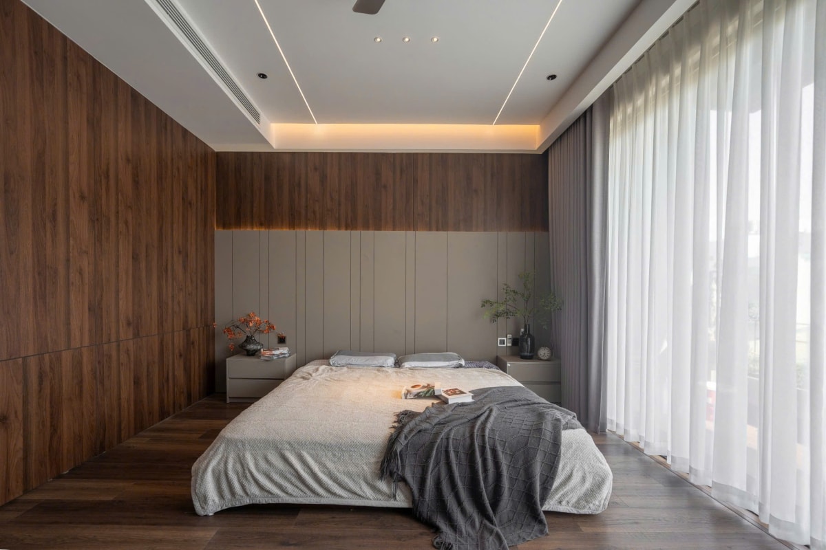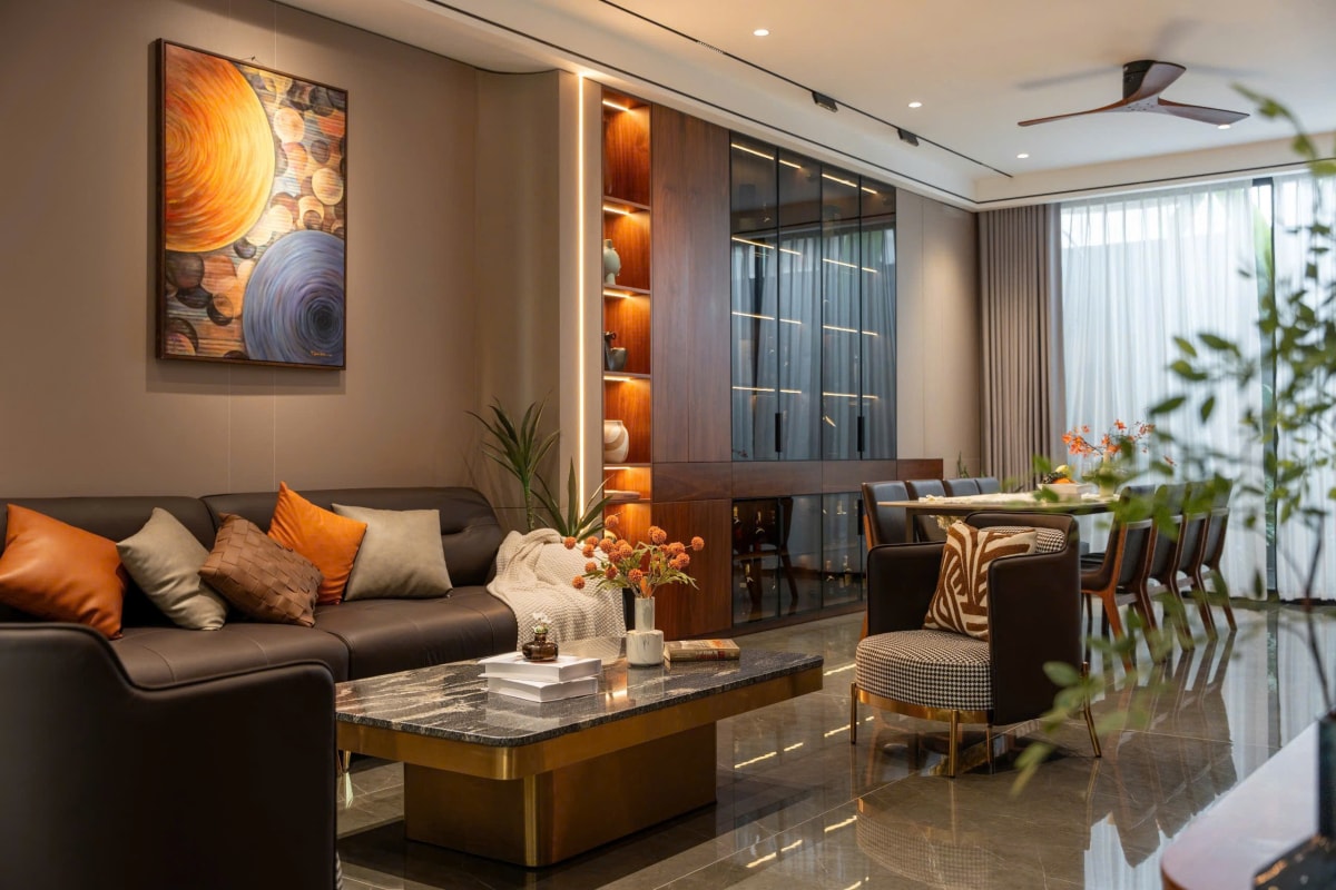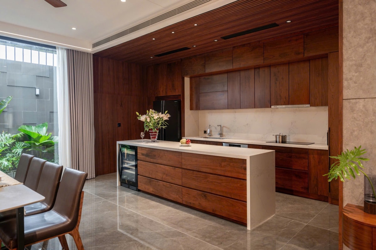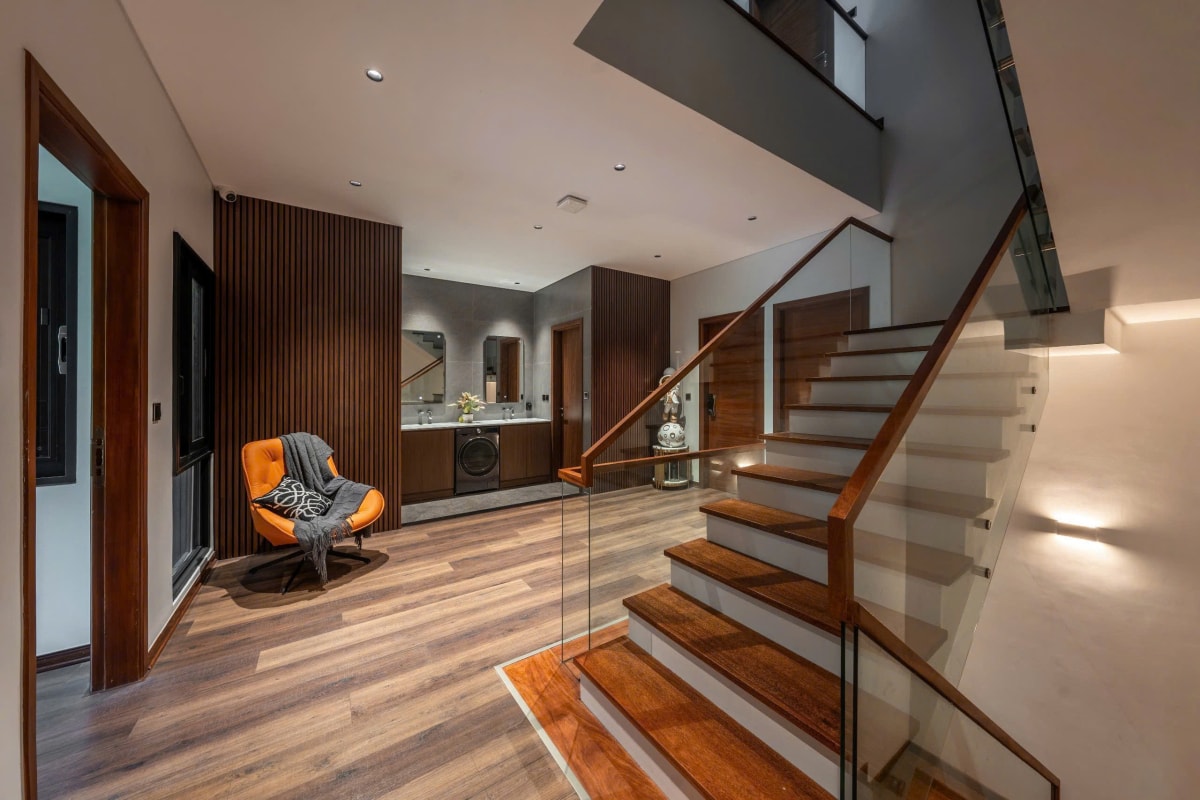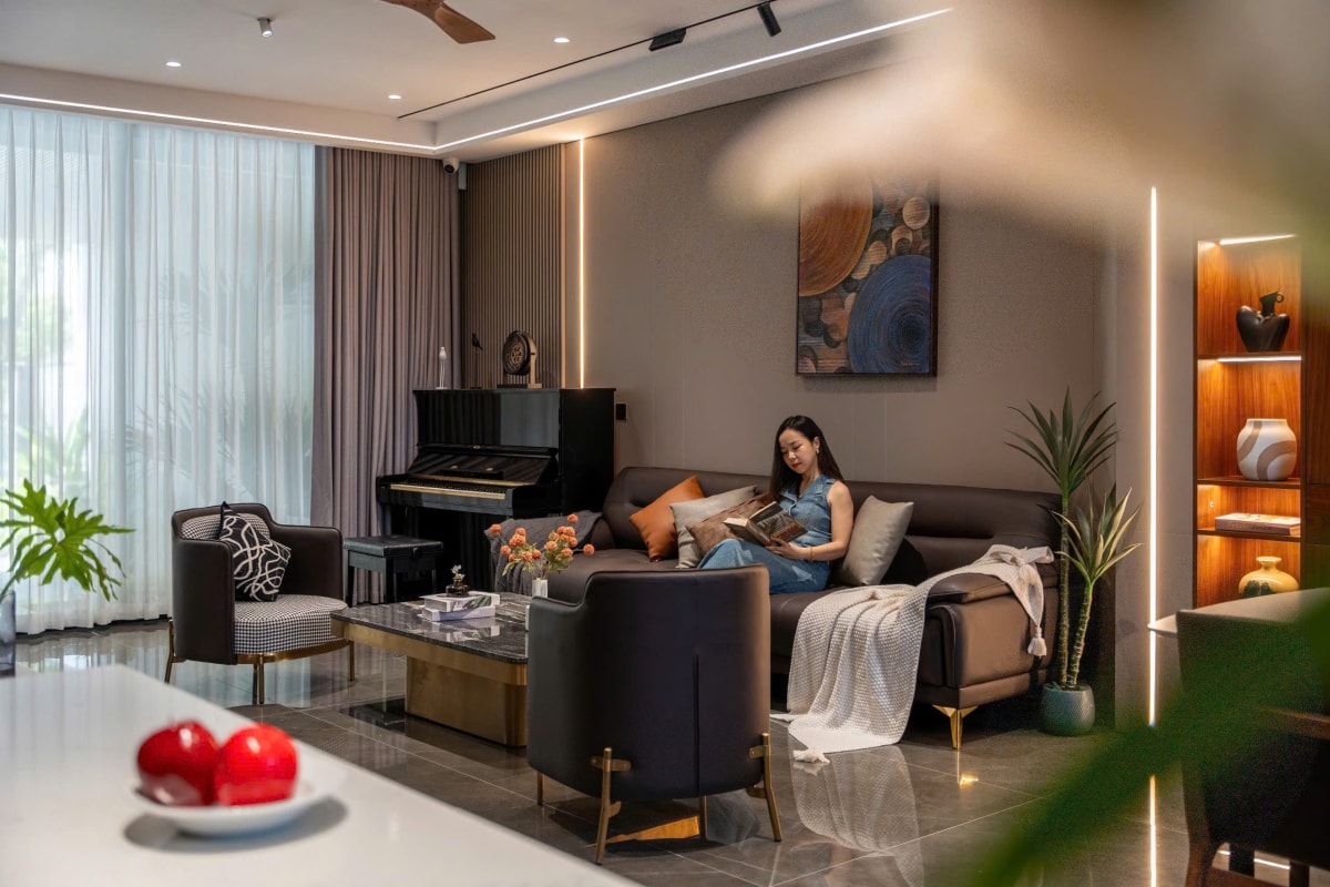 Căn nhà được thiết kế theo phong cách hiện đại, sử dụng chủ yếu nội thất gỗ, tạo nên không gian sống ấm cúng và bền vững.
