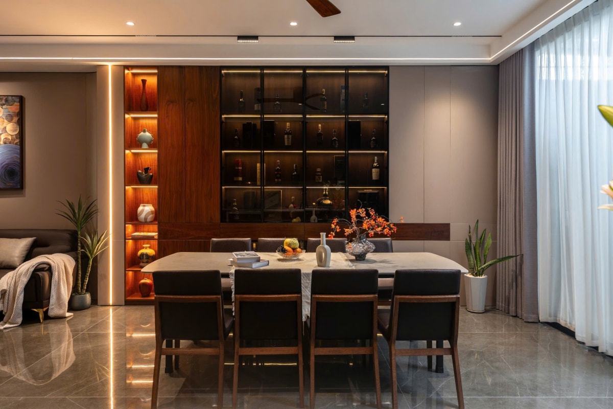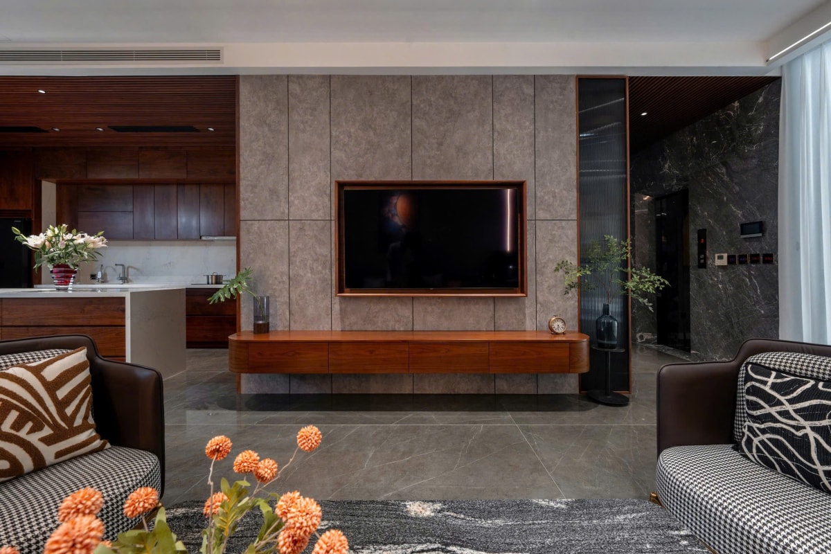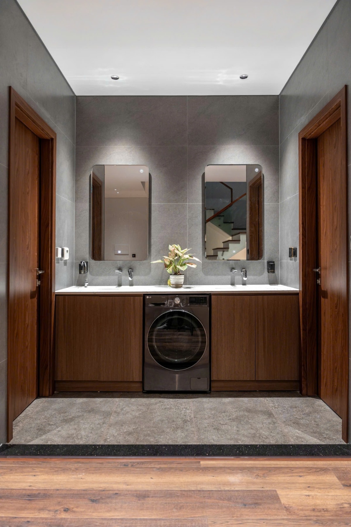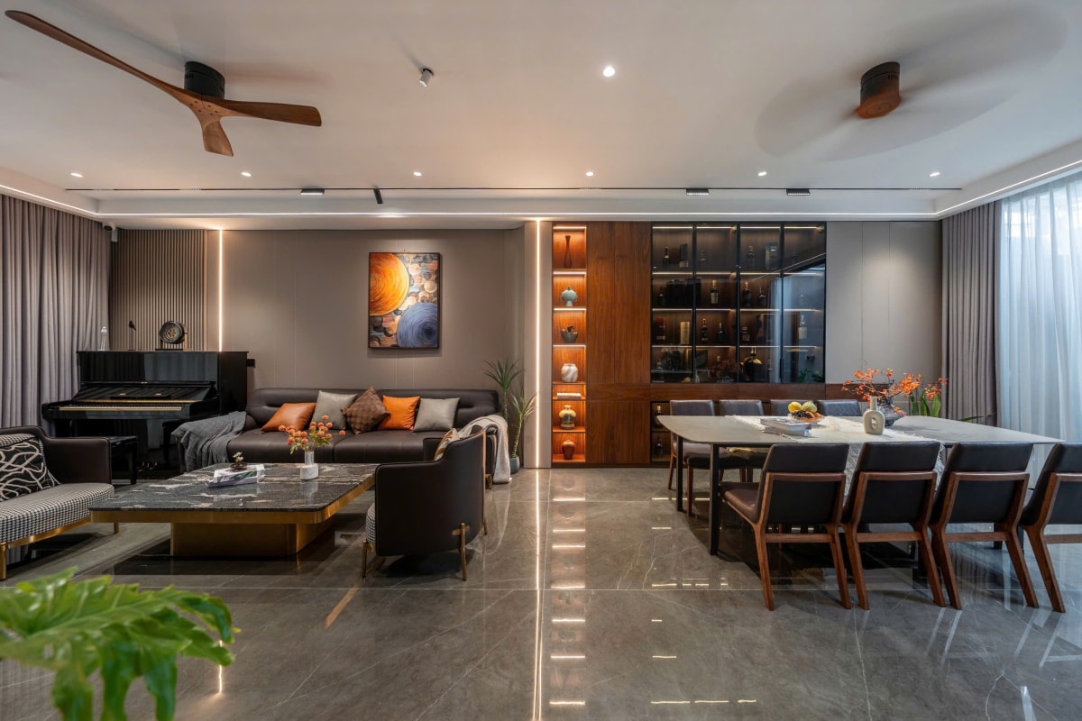 Căn nhà được thiết kế theo phong cách hiện đại, sử dụng chủ yếu nội thất gỗ, tạo nên không gian sống ấm cúng và bền vững.