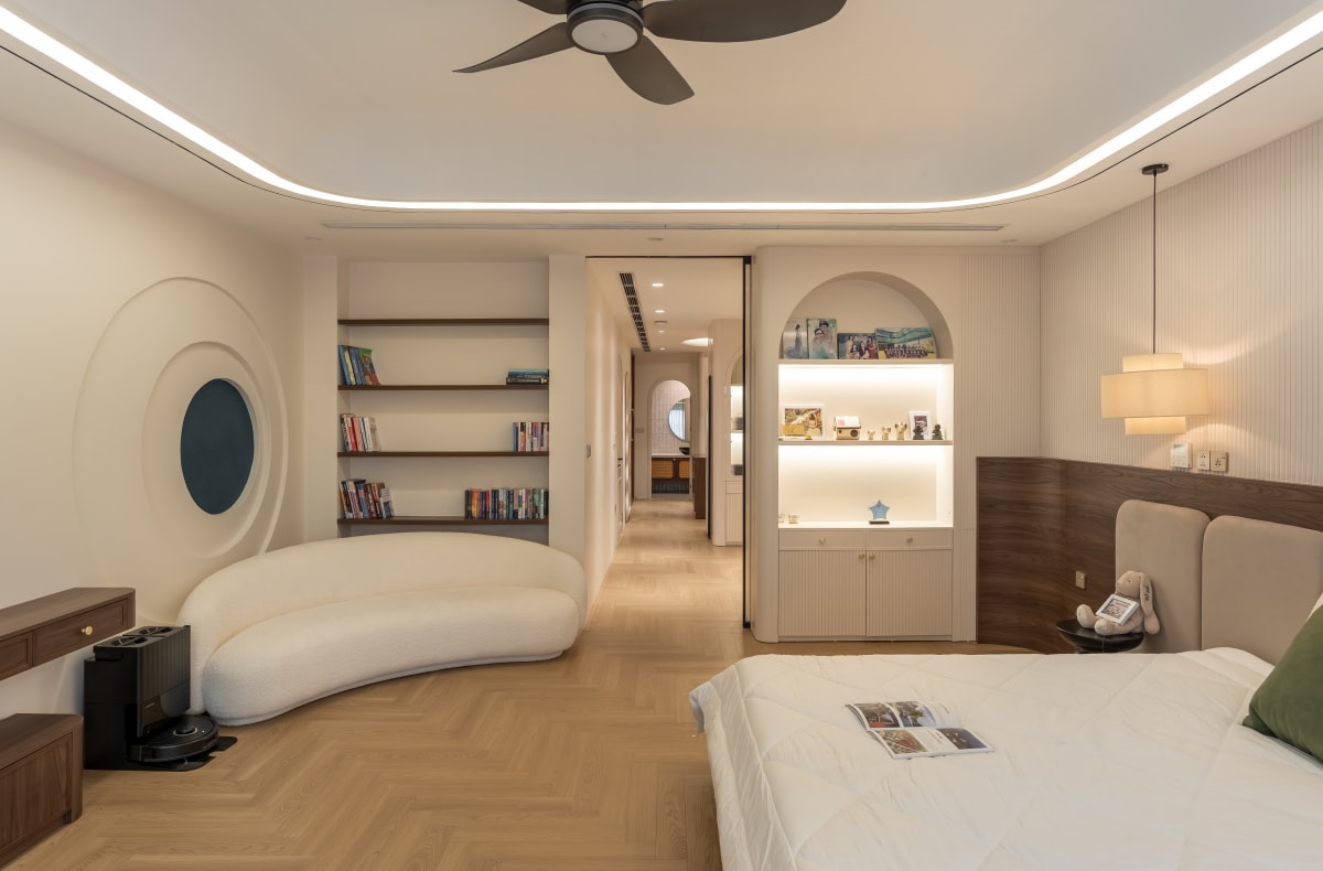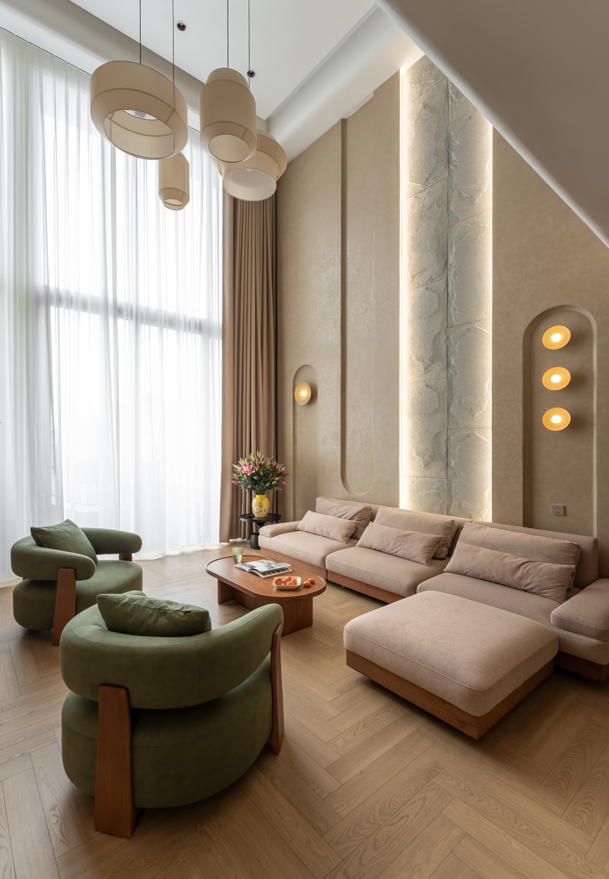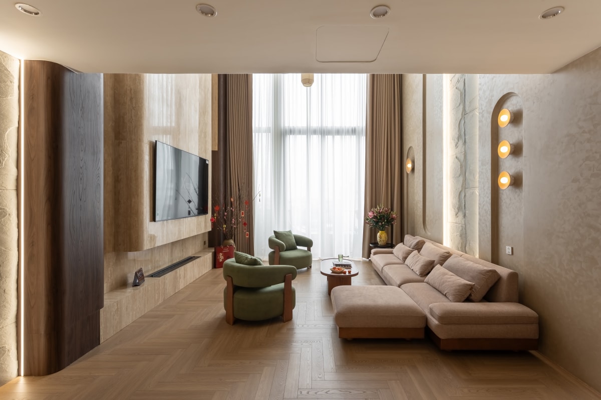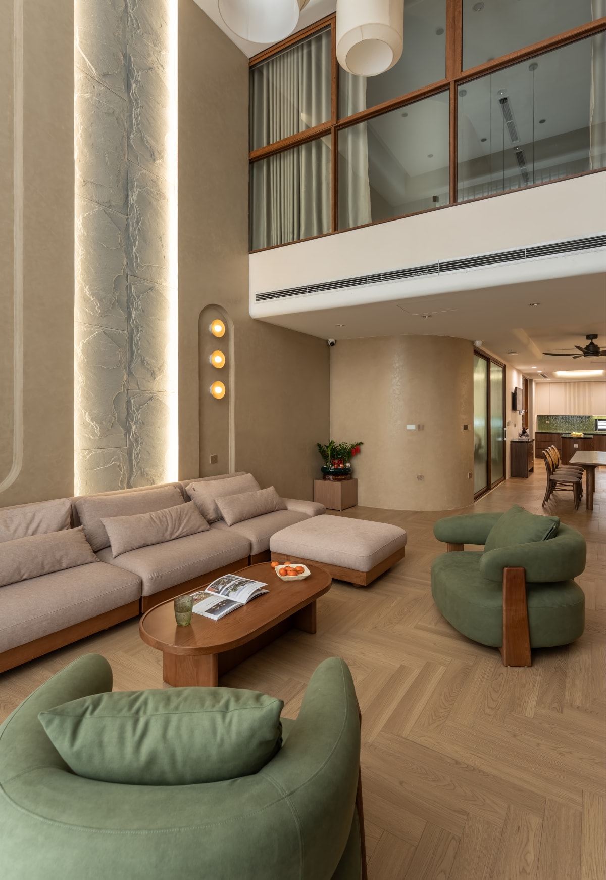 Căn nhà giải bài toán riêng tư và thông thoáng bằng hệ mặt đứng nhiều lớp, trong khi nội thất dùng đường cong, vật liệu tự nhiên để làm mềm không gian sống.