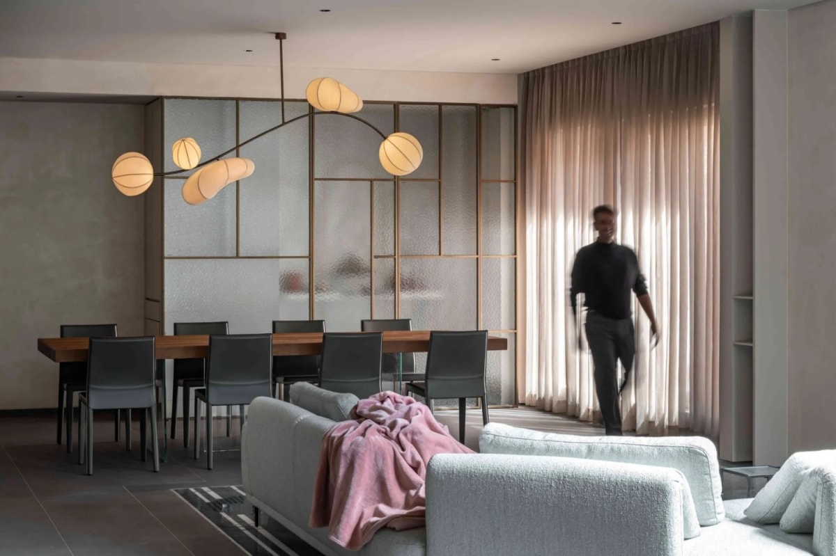 Phòng ăn với bàn gỗ dài và hệ đèn thả nghệ thuật.