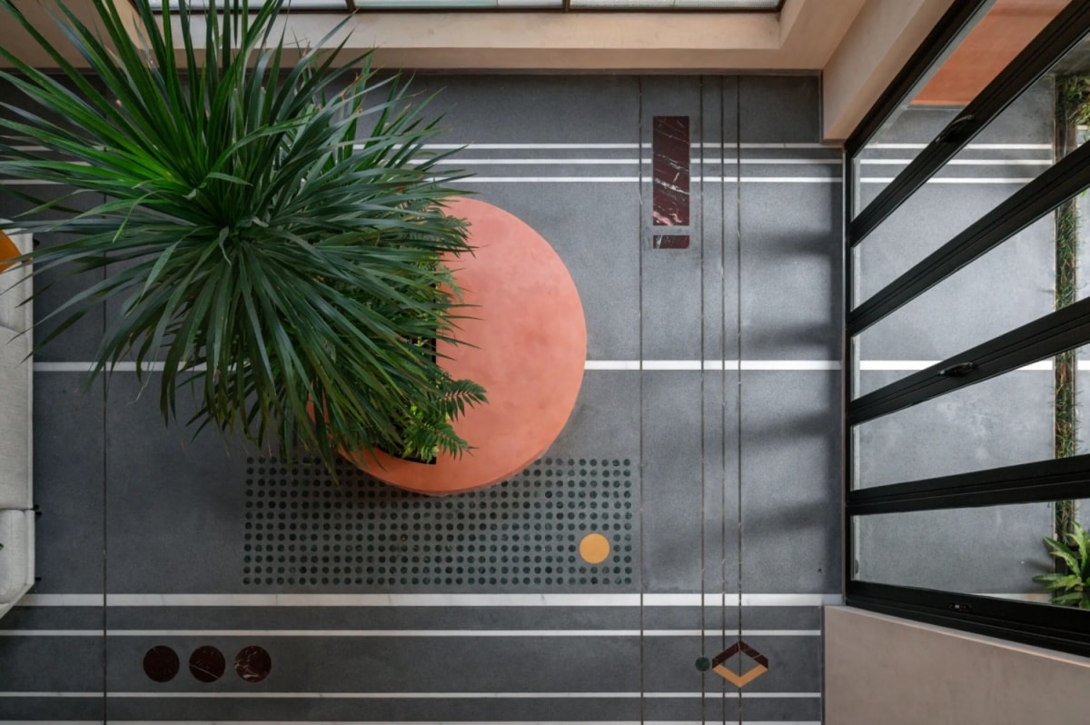 Khoảng thông tầng được bố trí bồn cây lớn trong chậu tròn, đặt trên nền gạch với những họa tiết hình học, vừa mang yếu tố trang trí vừa đưa mảng xanh vào trung tâm không gian sống.